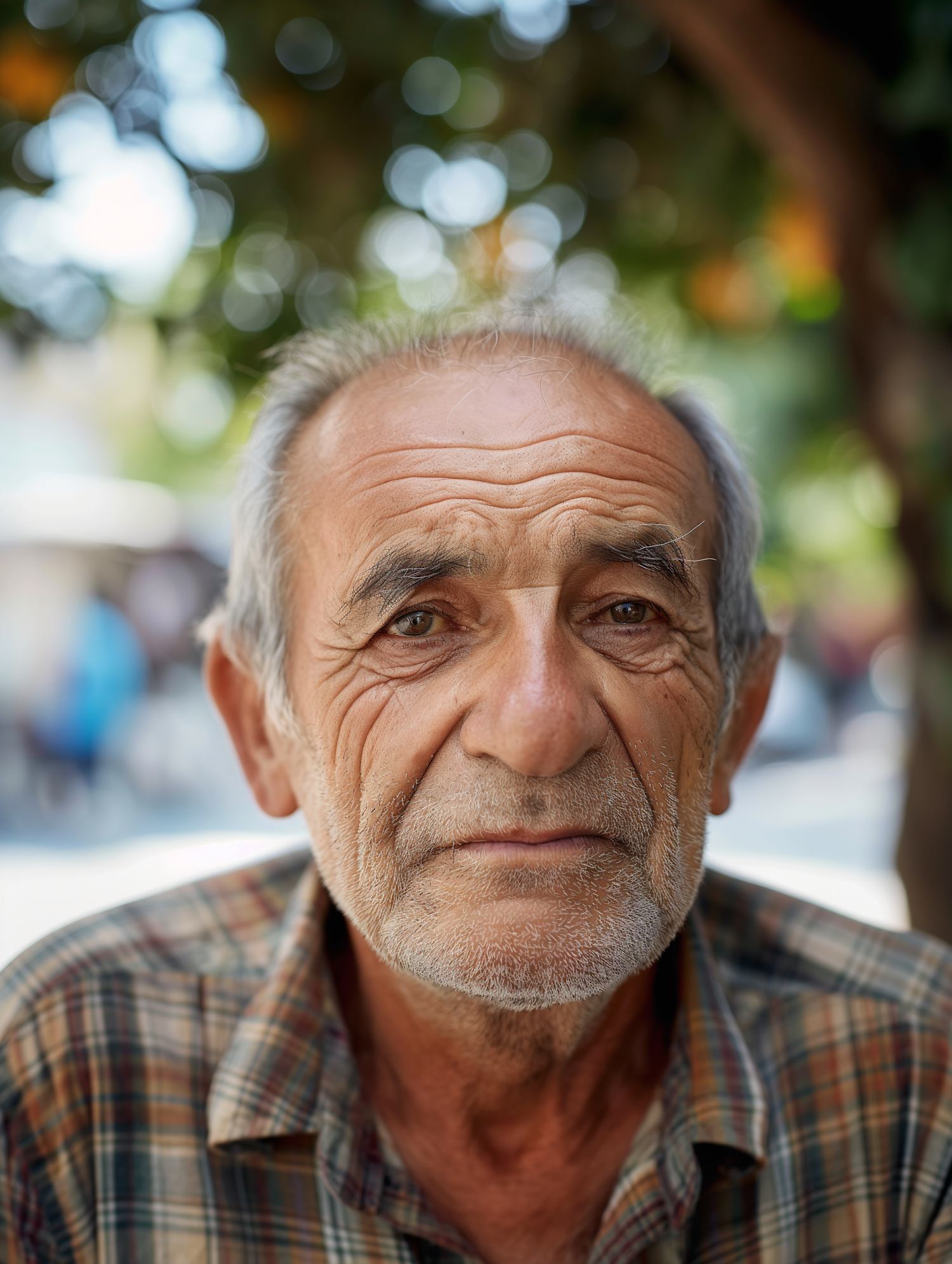 Elderly man with gray hair and beard in a plaid shirt, gazing thoughtfully outdoors with a blurred green background.