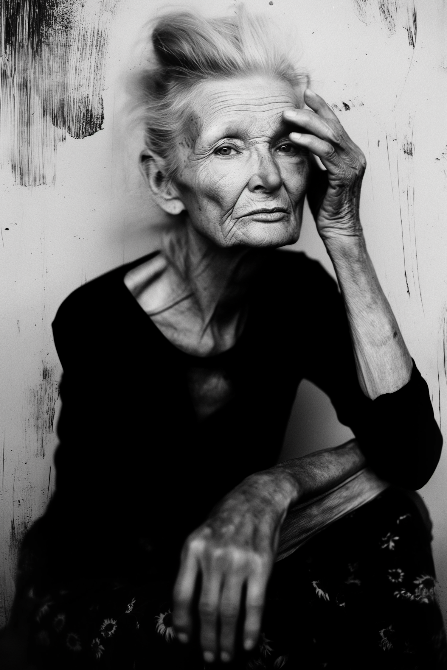 Black and white portrait of an elderly woman with expressive features, resting her head on her hand against a textured wall.