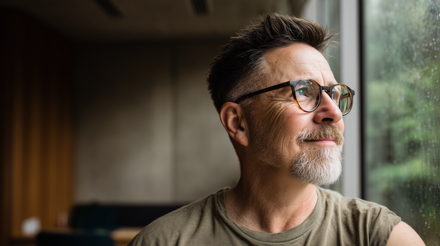 A thoughtful man with glasses and a beard gazes out a window on a rainy day, captured in soft, natural light.