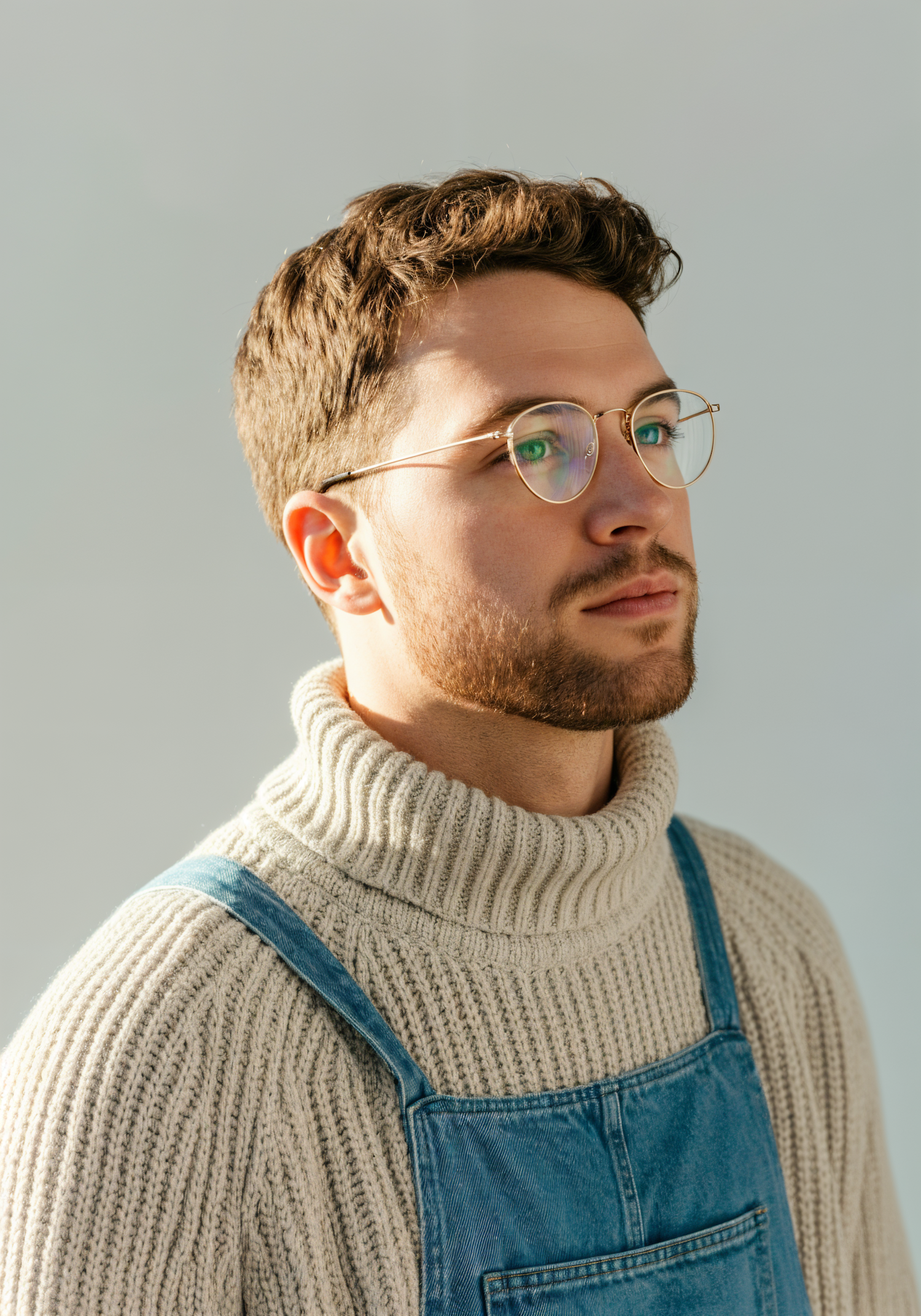 A thoughtful man in a cream turtleneck and denim overalls, wearing round glasses, gazes into the distance against a light background.