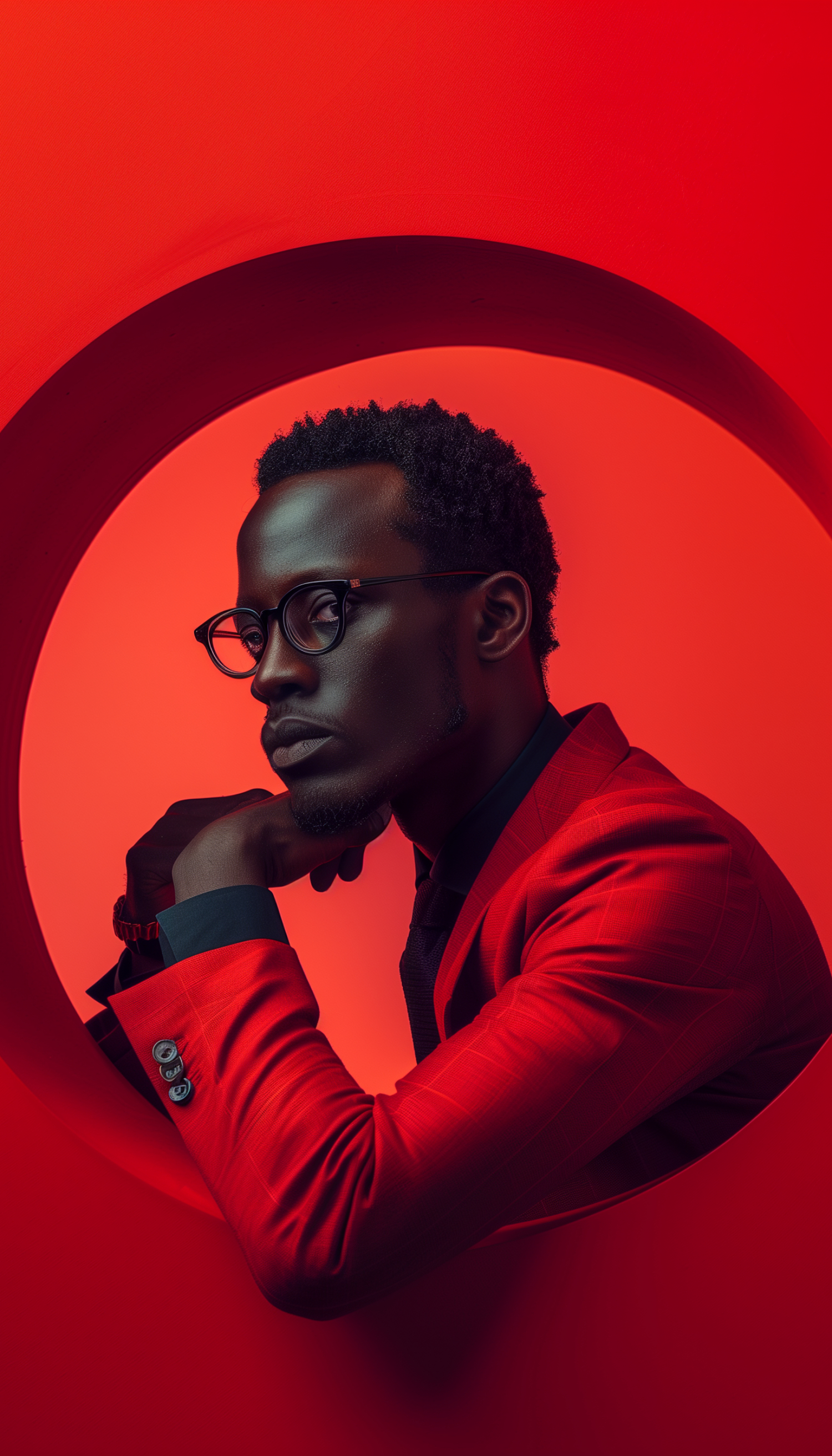 Stylish man in a red suit with glasses against a vibrant red background, exuding sophistication and elegance.