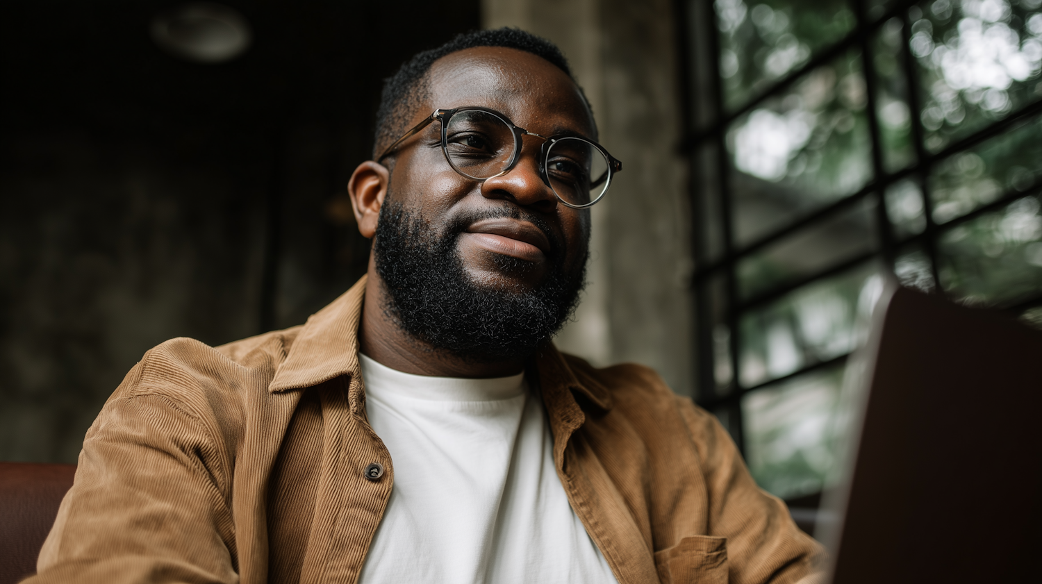 A man with glasses and a beard sits indoors, wearing a brown jacket and white shirt, with a window and greenery in the background.