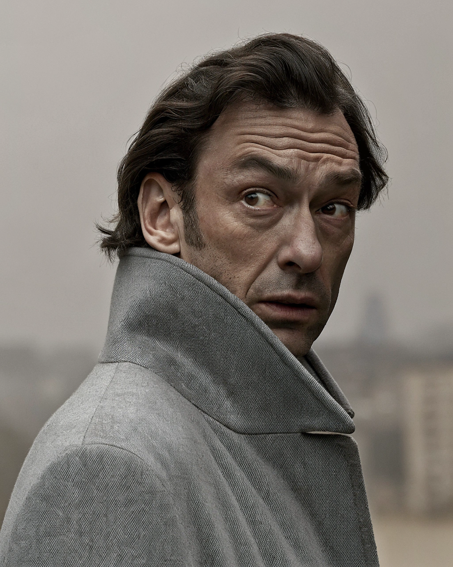 Close-up of a man in a high-collared gray coat, looking over his shoulder with a thoughtful expression against a muted urban backdrop.