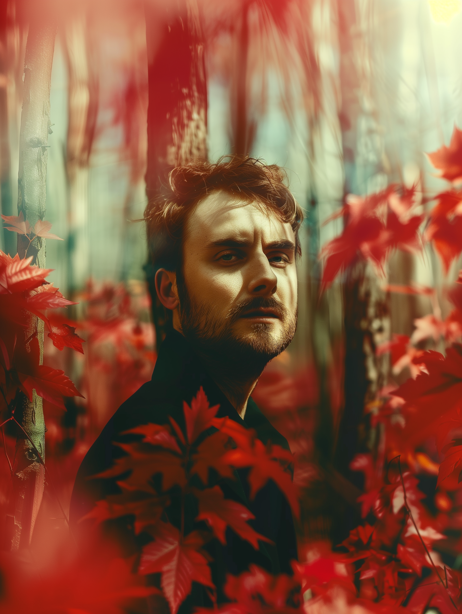 A contemplative man stands among vibrant red leaves in a sunlit forest, creating a serene yet intense atmosphere.