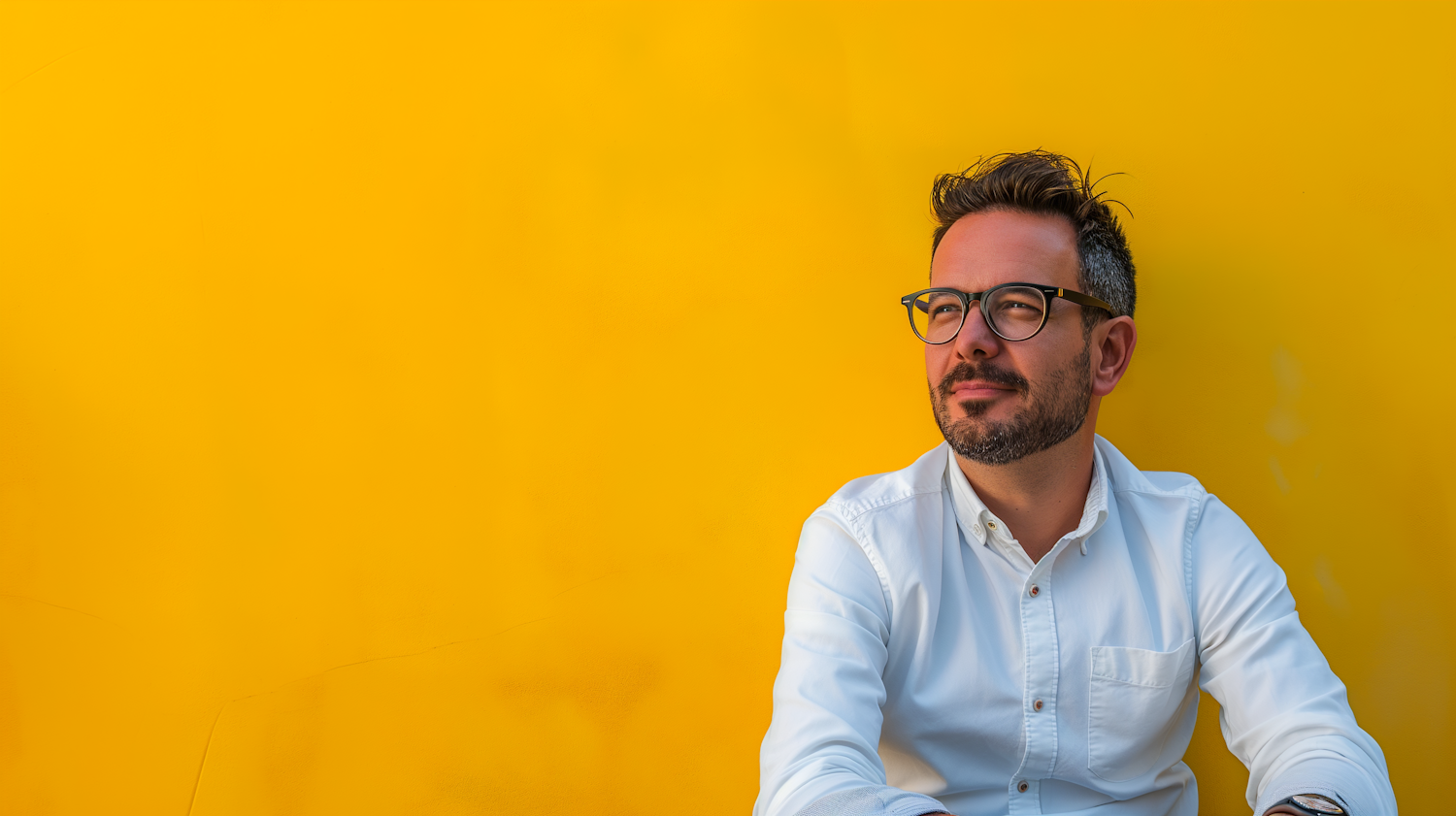 Thoughtful man with glasses against a vibrant yellow background, wearing a white shirt and gazing upward.