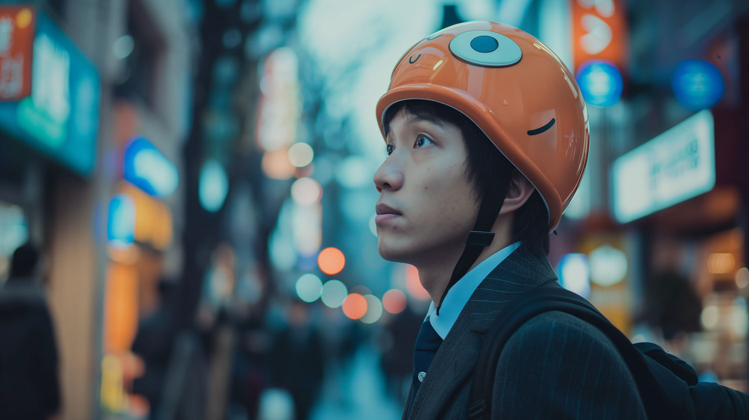 Asian man in a suit with an orange cartoon helmet looks up in a vibrant city street with neon lights.
