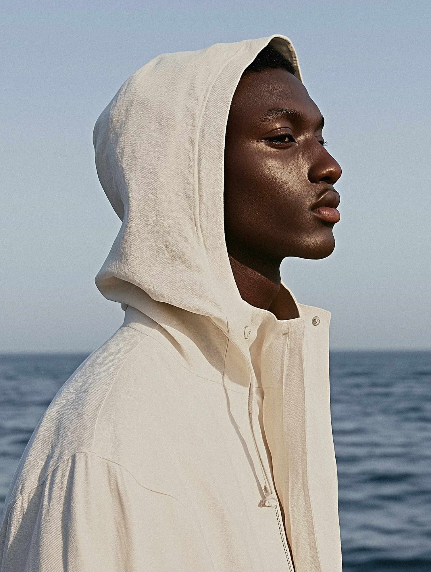 A serene portrait of a man in a cream hooded jacket by the ocean, with a calm expression and a minimalist background.