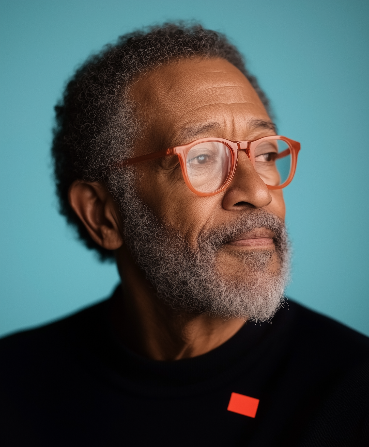 Elderly man with gray beard and orange glasses, wearing a dark sweater against a teal background, looking thoughtful.