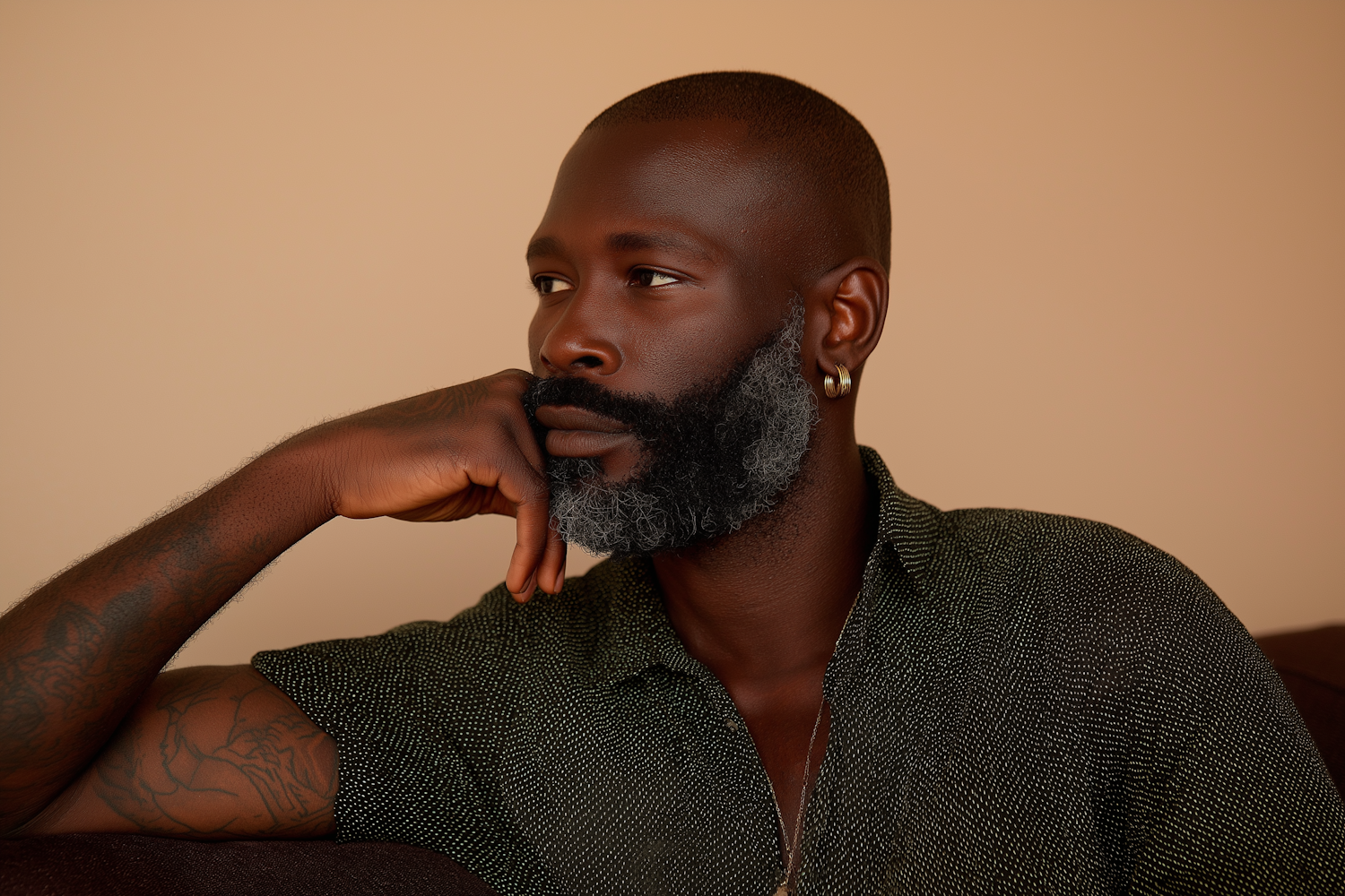 A portrait of a stylish individual with a thoughtfully posed appearance, set against a clean, neutral backdrop.
