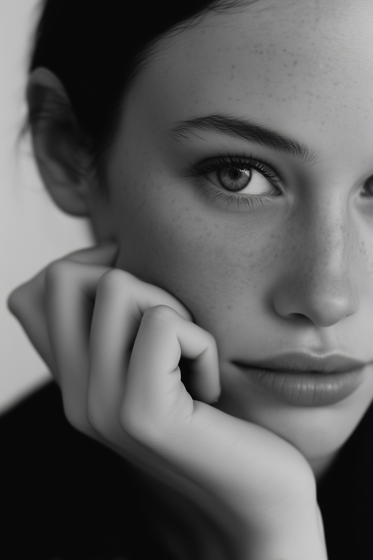 Black-and-white close-up portrait of a person with freckles, expressive eyes, and a contemplative pose, evoking a timeless artistic mood.
