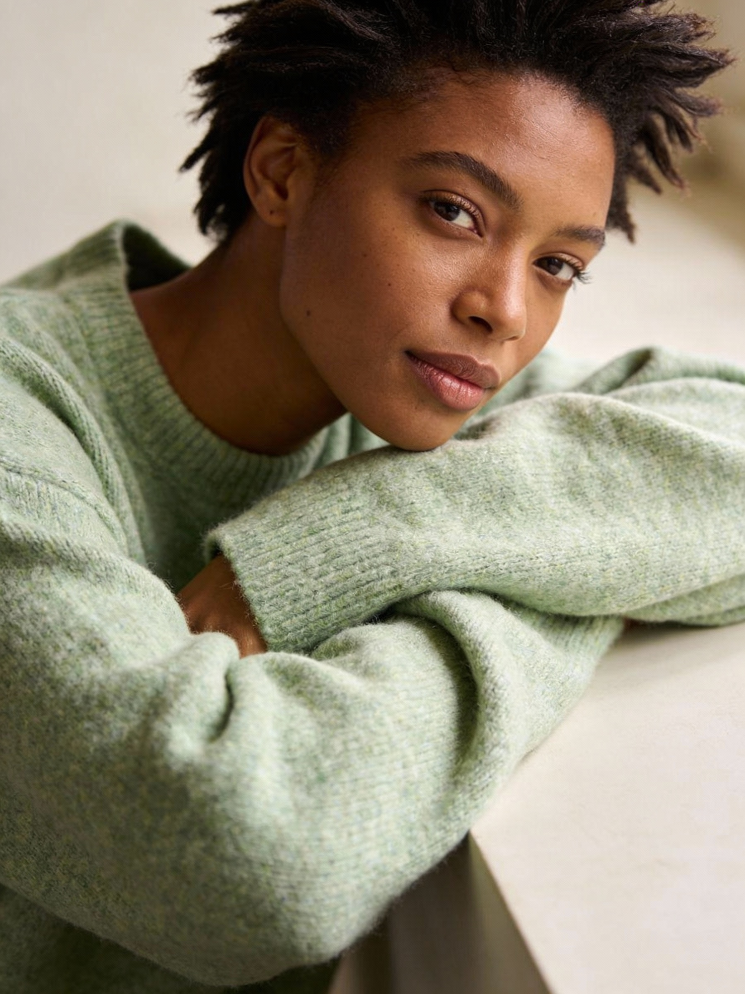A Black woman wearing a light house sweater in soft light green tones, featuring a cozy texture and relaxed fit. Her serene expression, gentle eyes, and soft gaze convey calm confidence. She has a trendy, well‑styled hairstyle that adds modern flair. The lighting is ambient and neutral, highlighting the sweater’s tactile details within a minimalist, uncluttered setting.