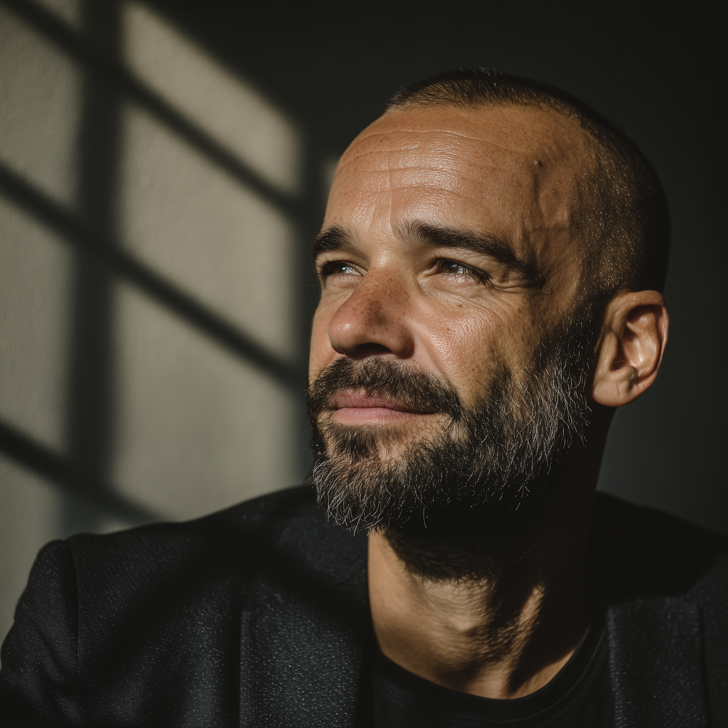 Portrait of a man with a shaved head and beard, gazing thoughtfully in dramatic lighting with window shadows in the background.