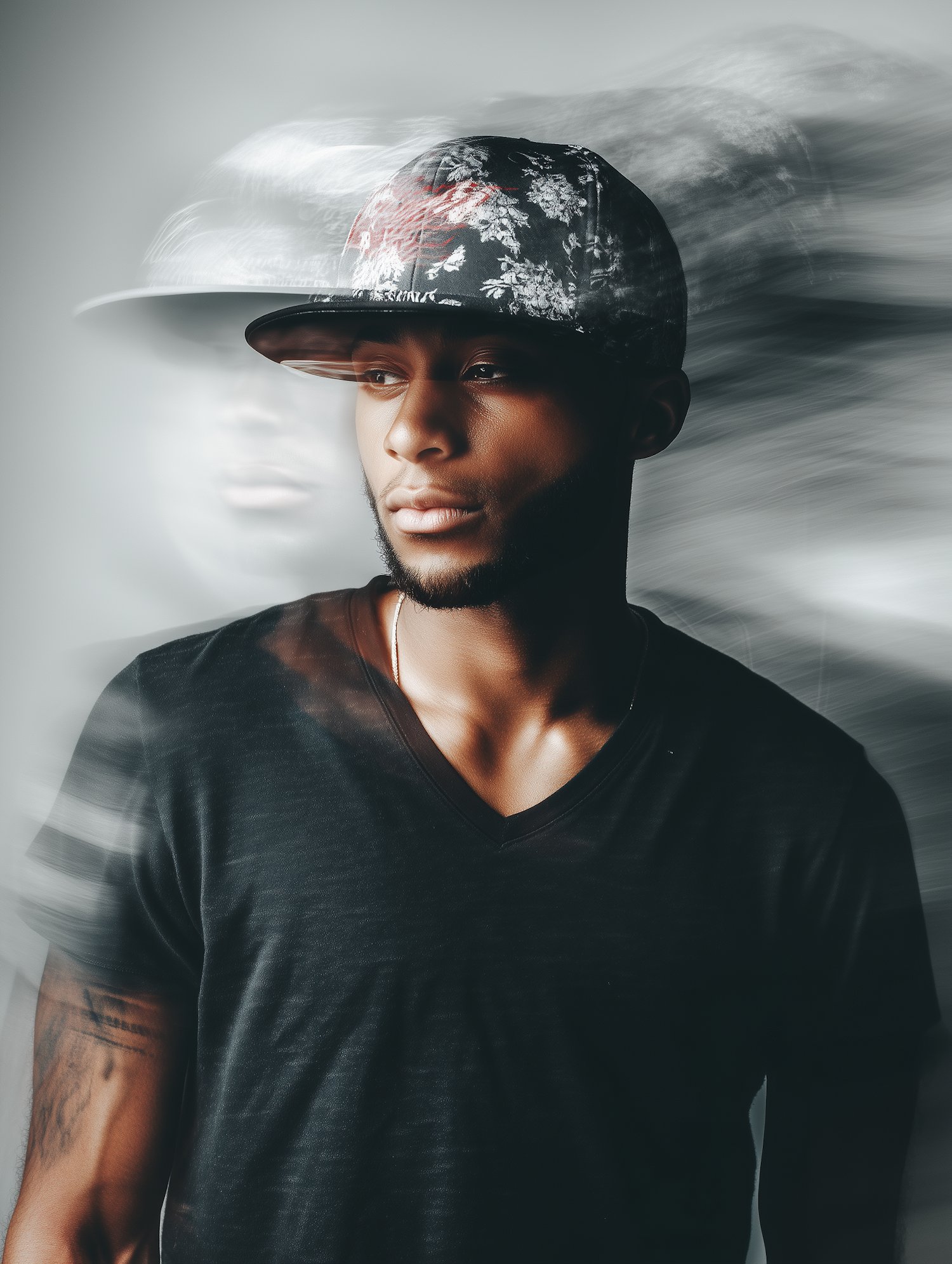 Stylish young man in a floral cap and black V-neck shirt, with a motion blur effect adding a dynamic, artistic vibe to the portrait.