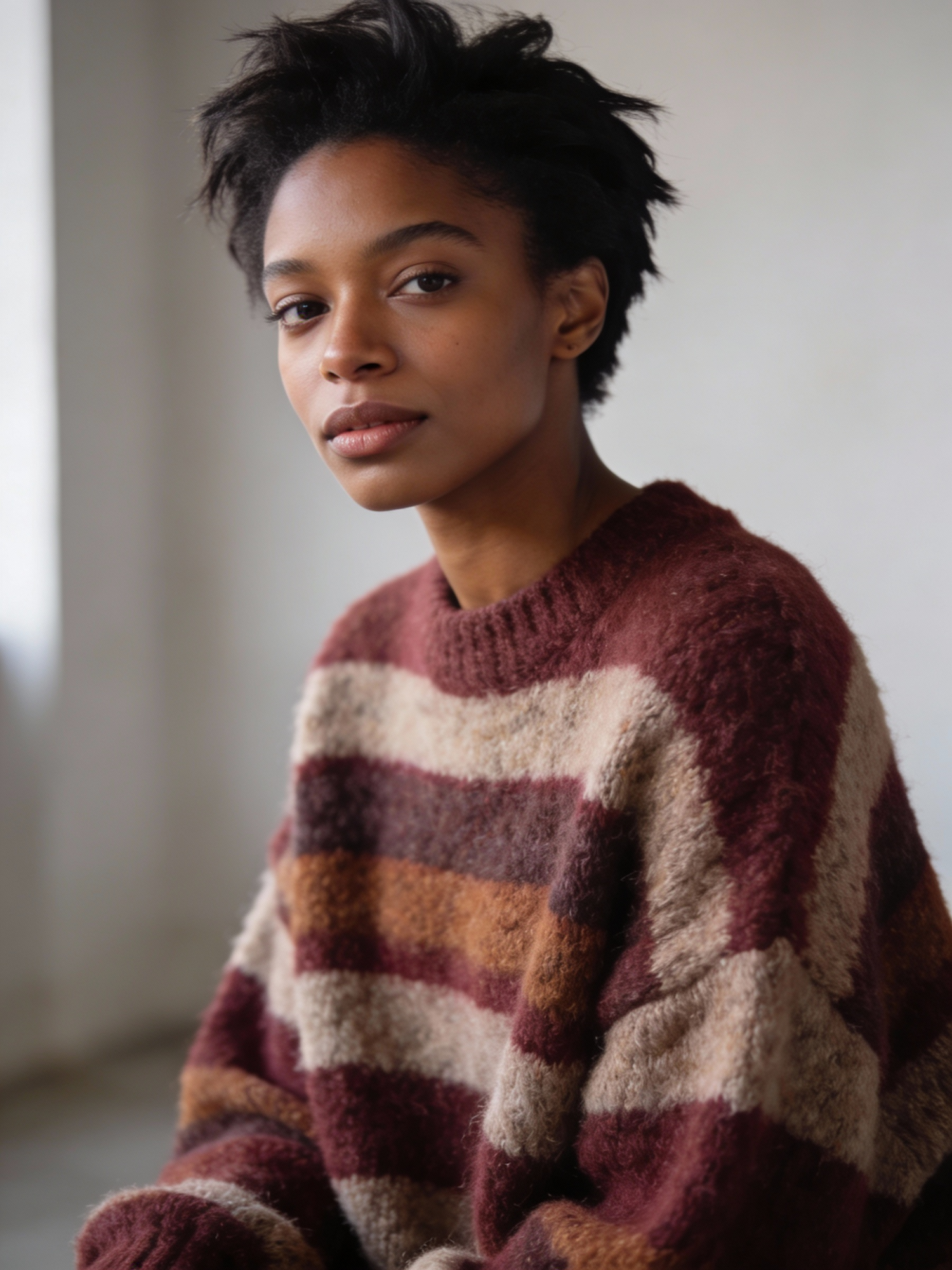 A person in a warm-toned striped sweater sits in soft lighting, exuding a calm and thoughtful presence against a minimal background.