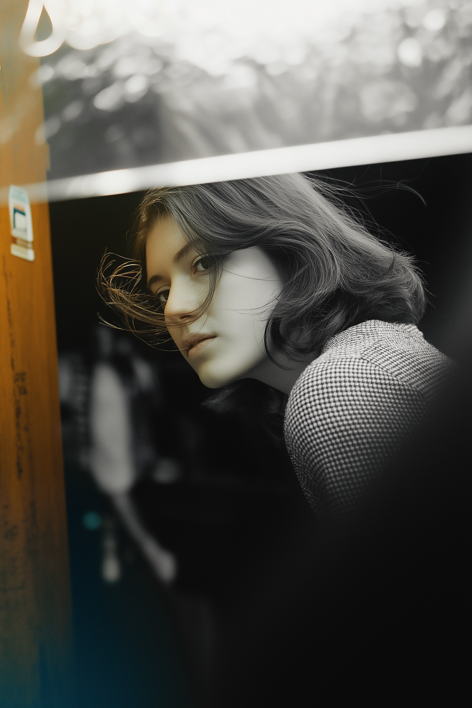 A thoughtful portrait of a young woman with dark hair and a checkered top, set against a dark, blurred background.