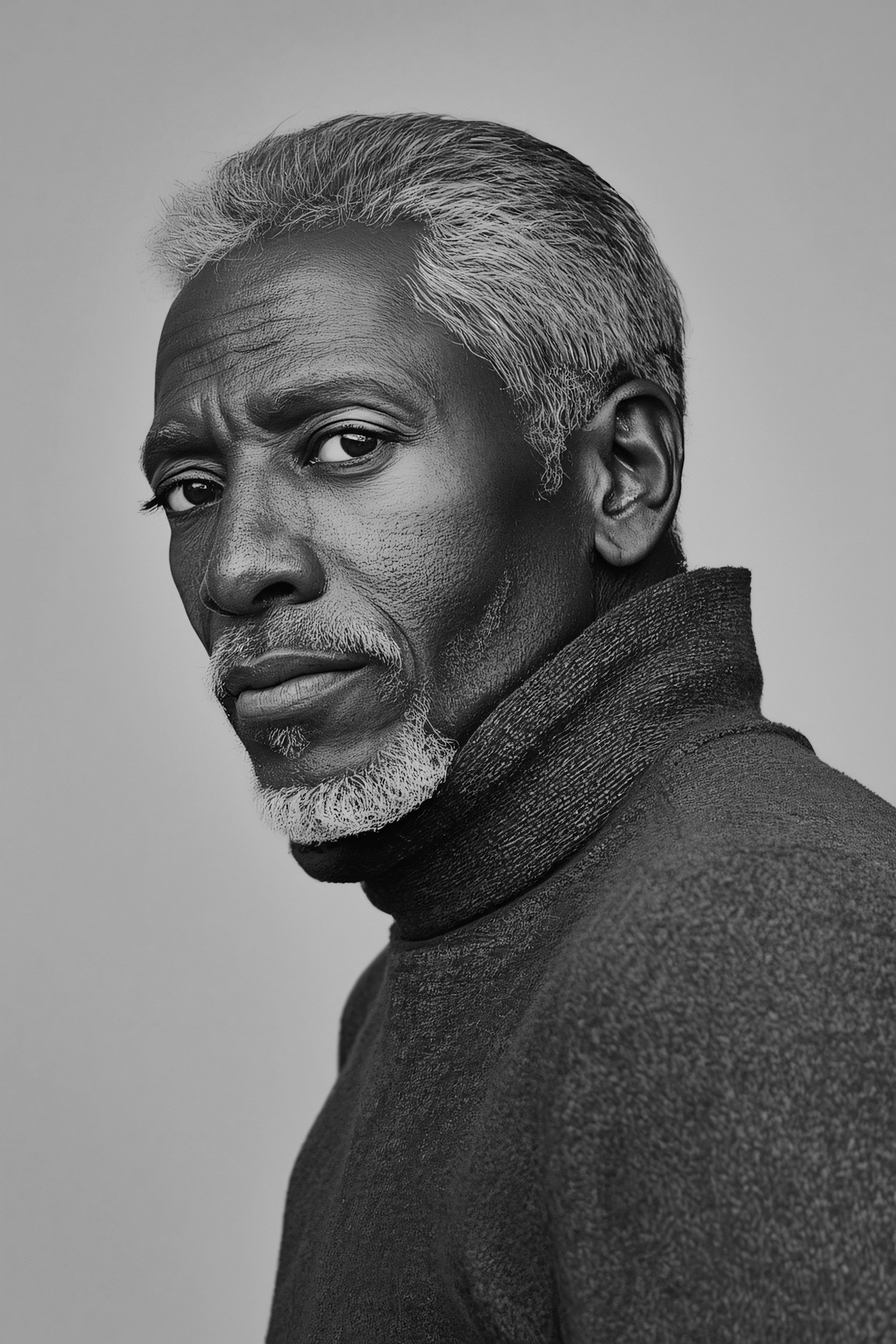 Grayscale portrait of a mature man with gray hair and beard, wearing a high-collared sweater, exuding a thoughtful and composed demeanor.