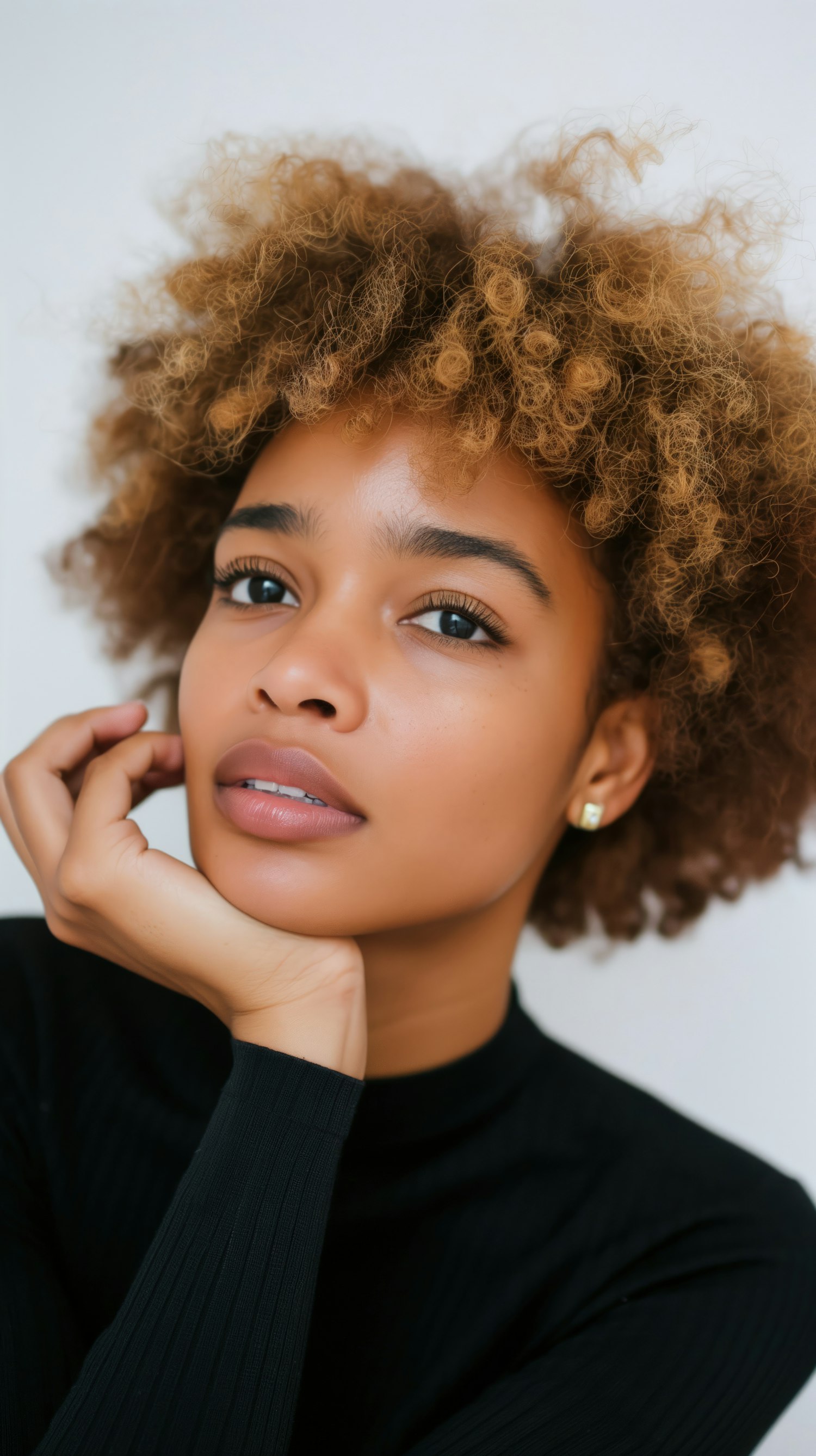 Portrait of a young woman with curly hair and serene expression, wearing a black top and earrings against a neutral background.
