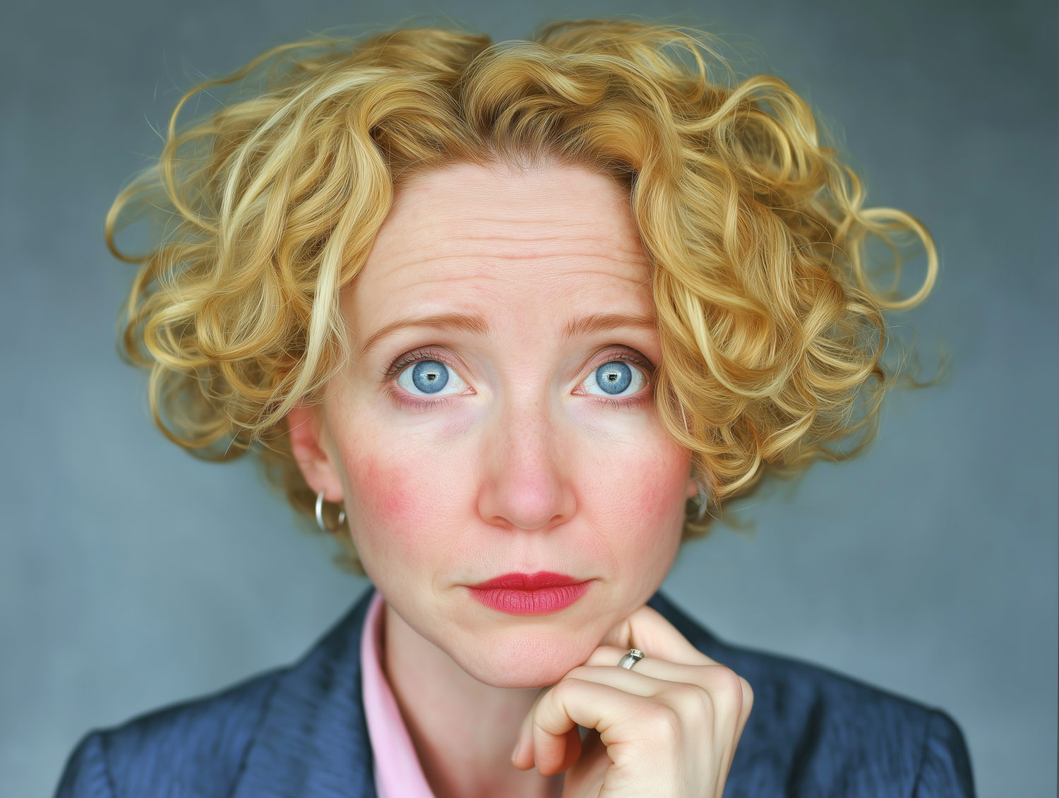 Close-up of a person with curly blonde hair and blue eyes, wearing a blazer, gazing upward thoughtfully against a gray background.