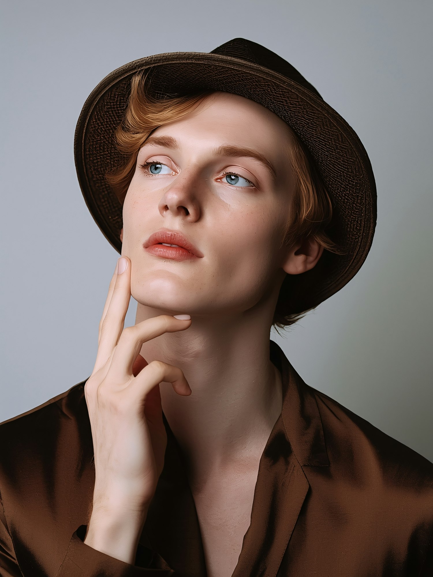 A thoughtful individual in a brown hat and shirt gazes upward, their light blonde hair and blue eyes highlighted against a neutral background.