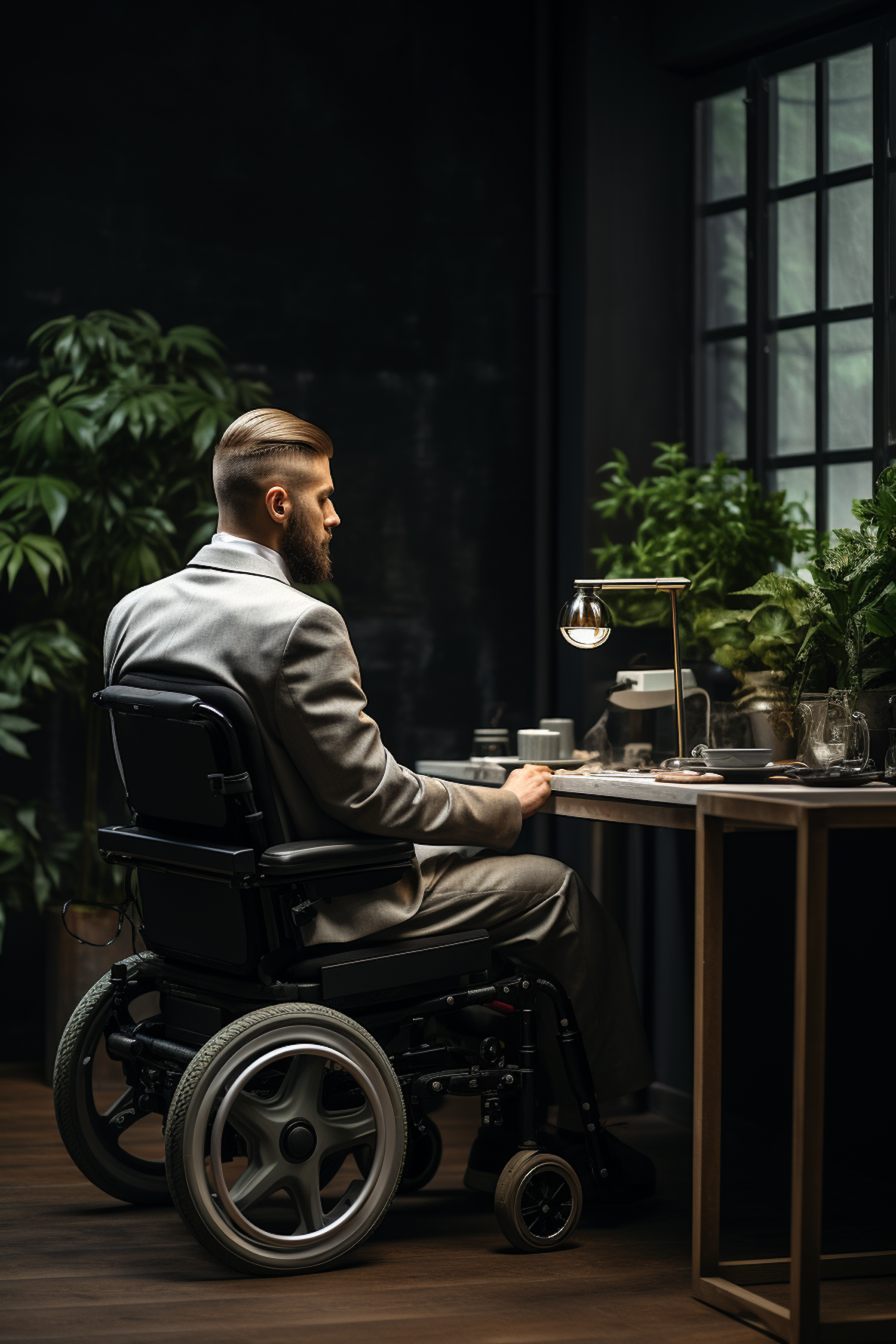 Man in a wheelchair wearing a gray suit, sitting at a desk with plants and modern decor, in a dimly lit room.