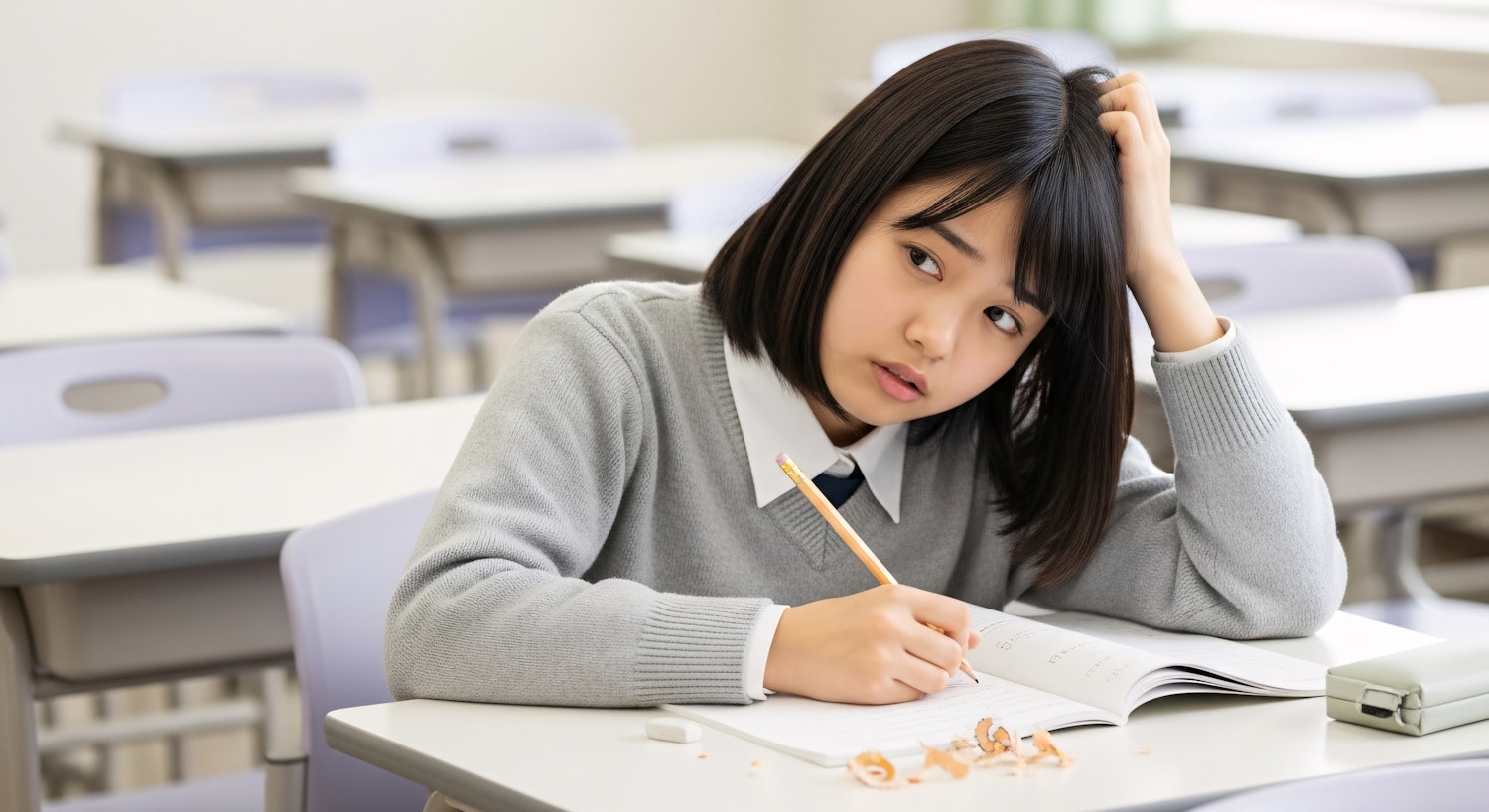 A student in a classroom, holding a pencil and looking thoughtful, with a notebook and pencil shavings on the desk.