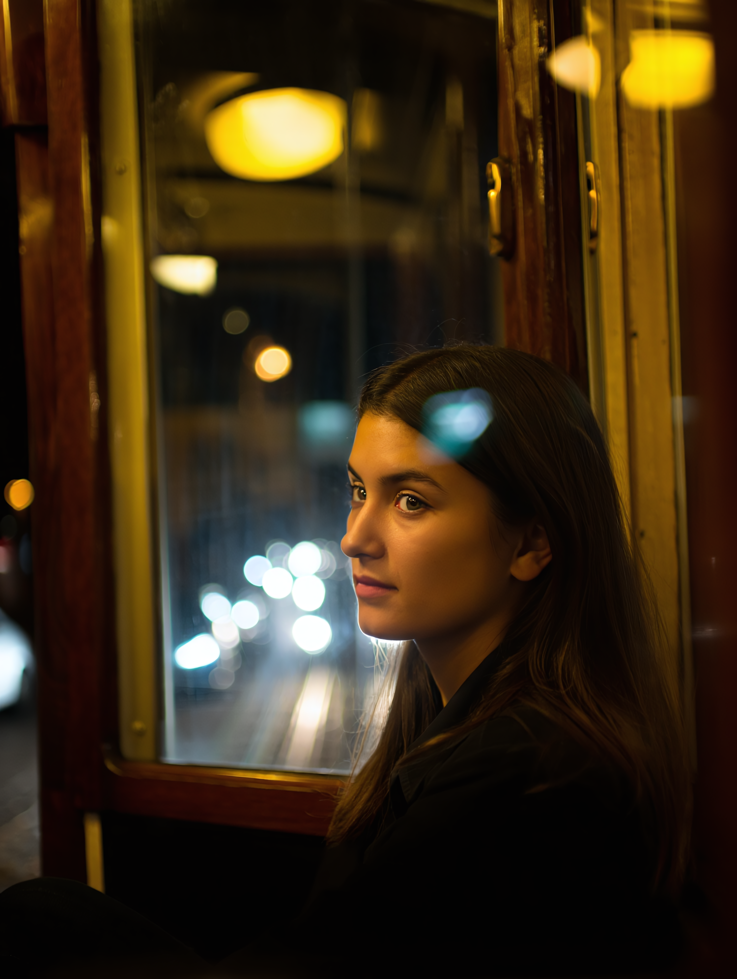 A young woman sits in a warmly lit tram, gazing out the window at a blurred cityscape with glowing streetlights.