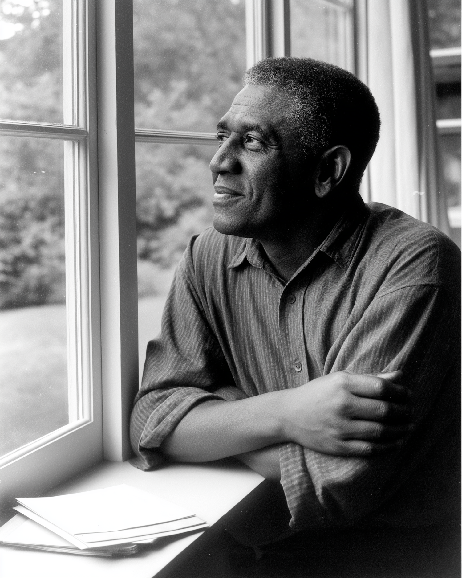 Black-and-white portrait of a thoughtful man gazing out a window, arms crossed on the sill, with soft light and a serene atmosphere.