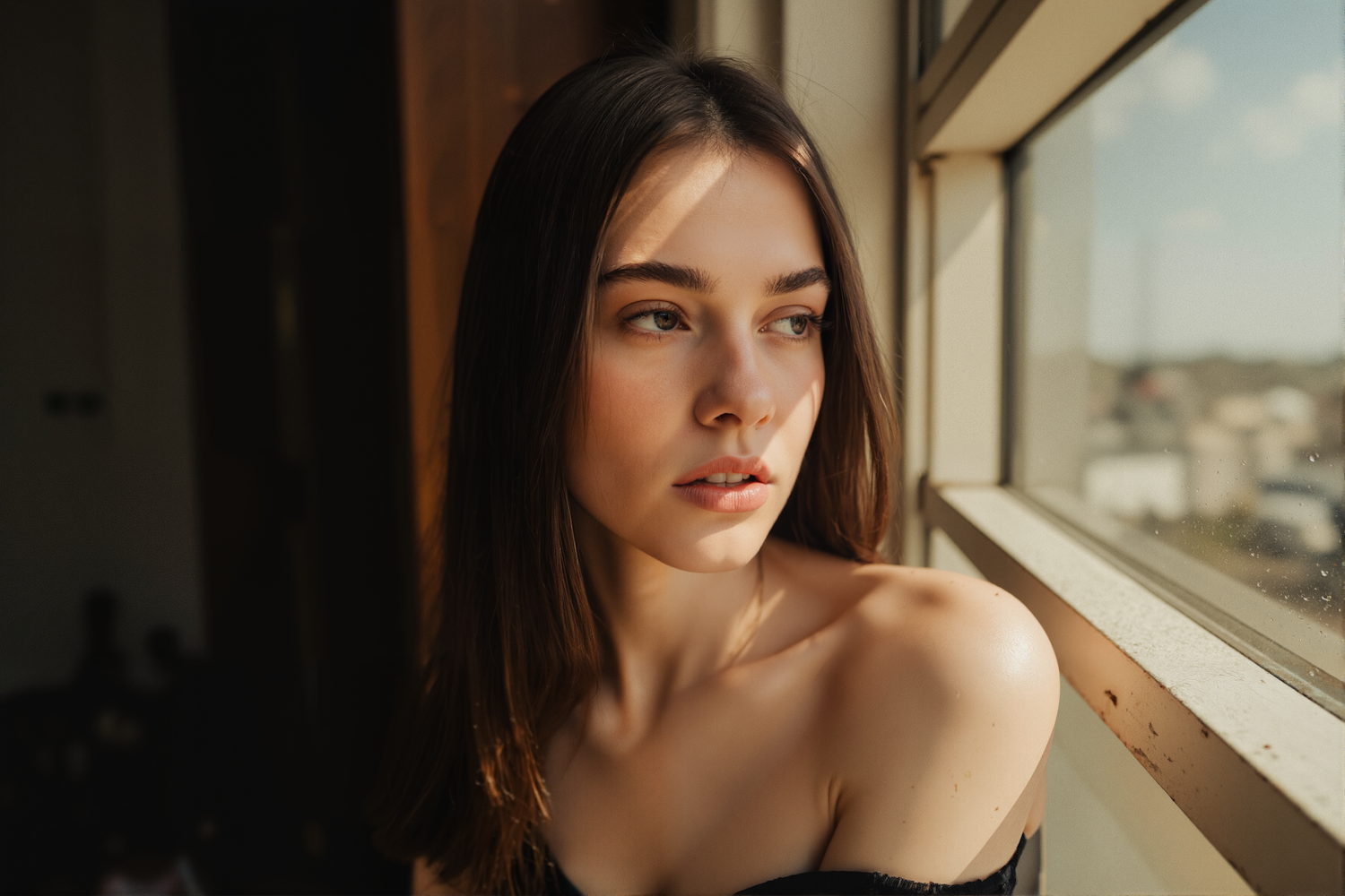 A thoughtful young woman with long brown hair and green eyes gazes out a sunlit window, her bare shoulders softly illuminated.