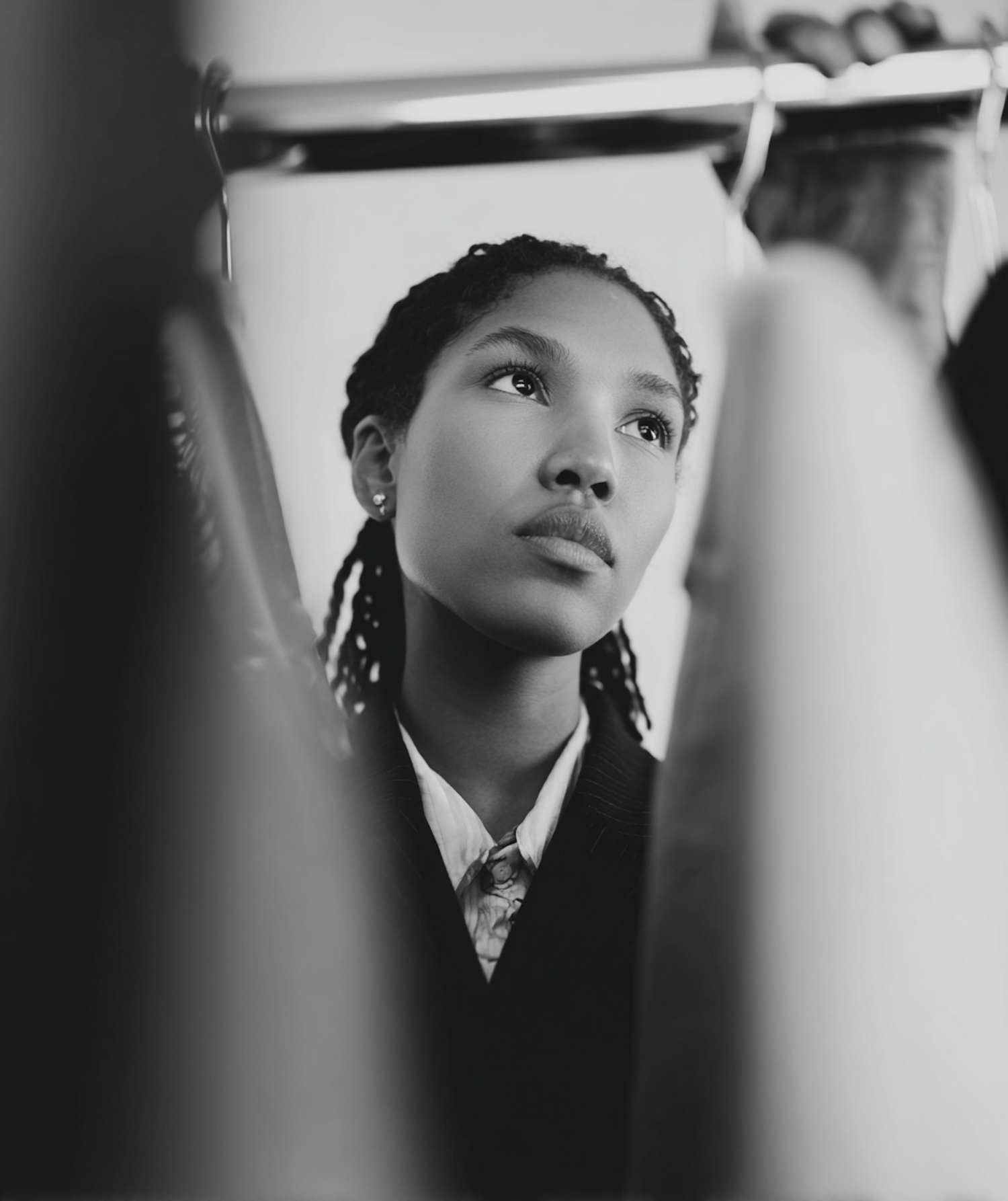 Black-and-white portrait of a woman with braided hair looking upwards thoughtfully, framed by hanging garments. Elegant and artistic.