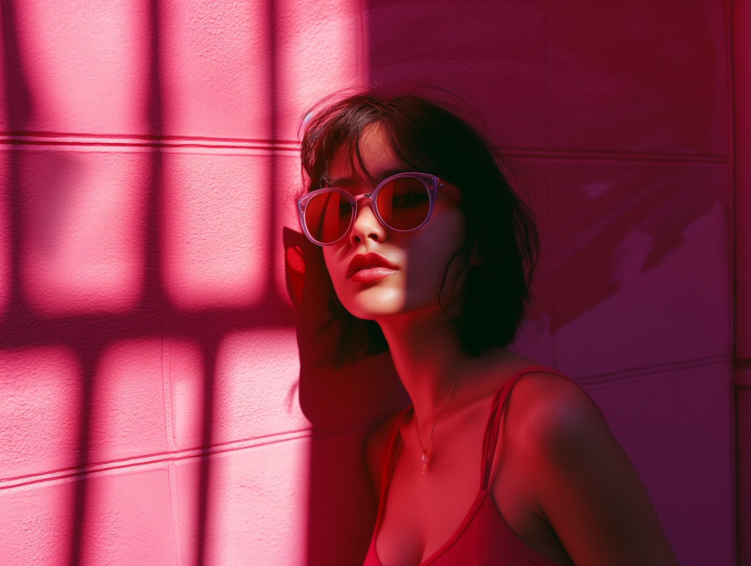 Stylish woman in sunglasses against a vibrant pink wall, casting dramatic shadows. Modern fashion and bold colors create a striking image.