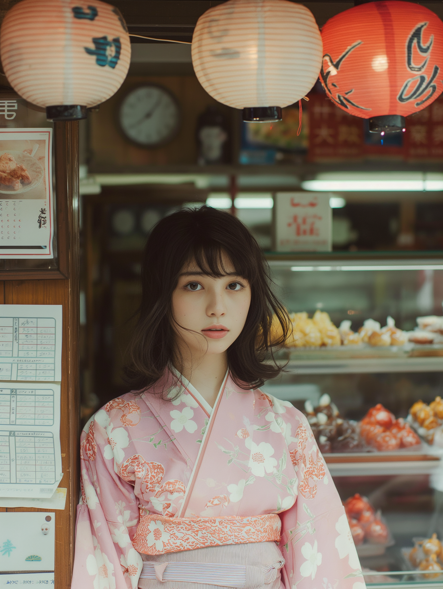 Asian woman in a pink floral kimono stands in front of a Japanese shop with lanterns and sweets display, exuding cultural elegance.