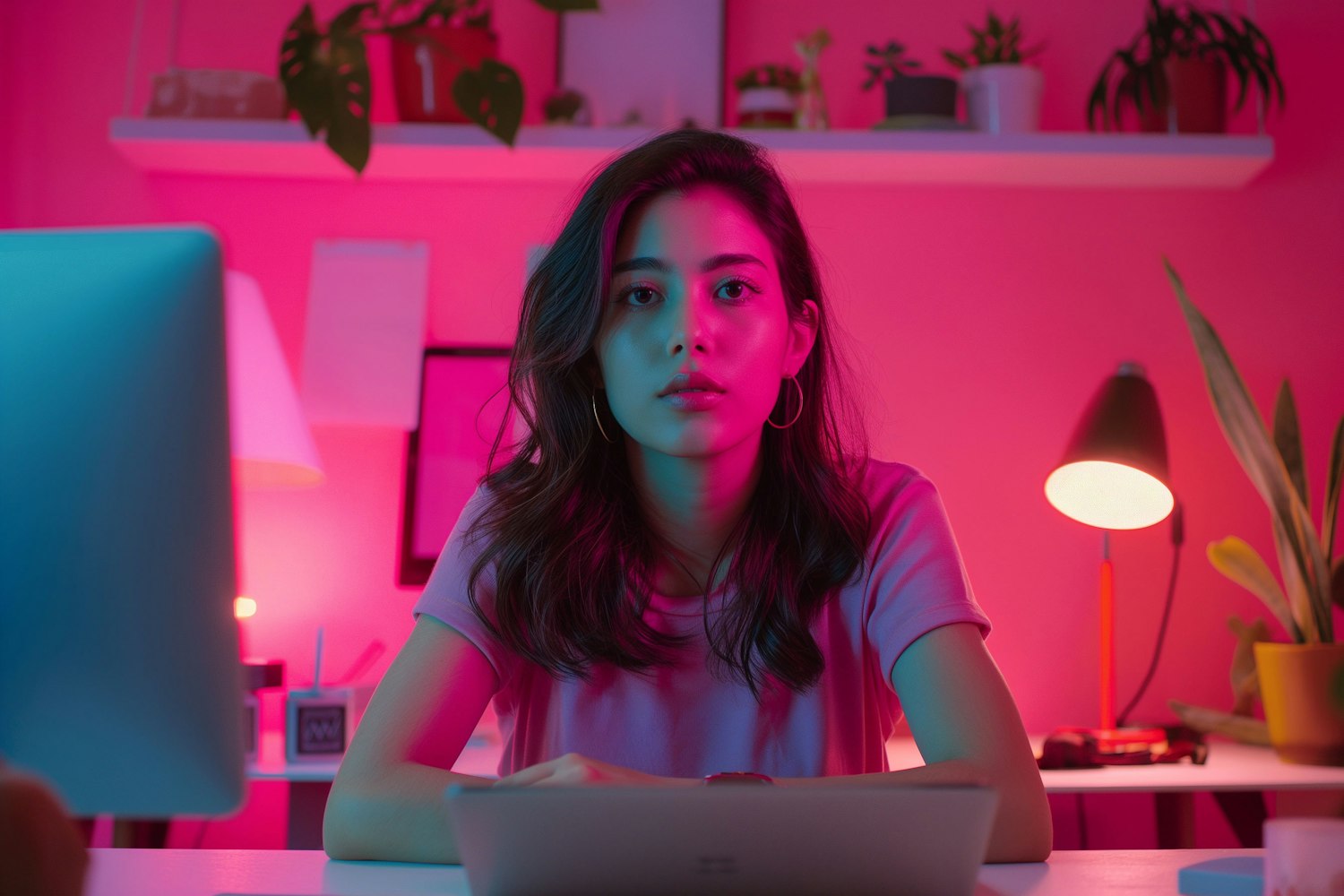 Young woman in a pink-lit room, sitting at a desk with a computer, surrounded by plants and colorful decor.