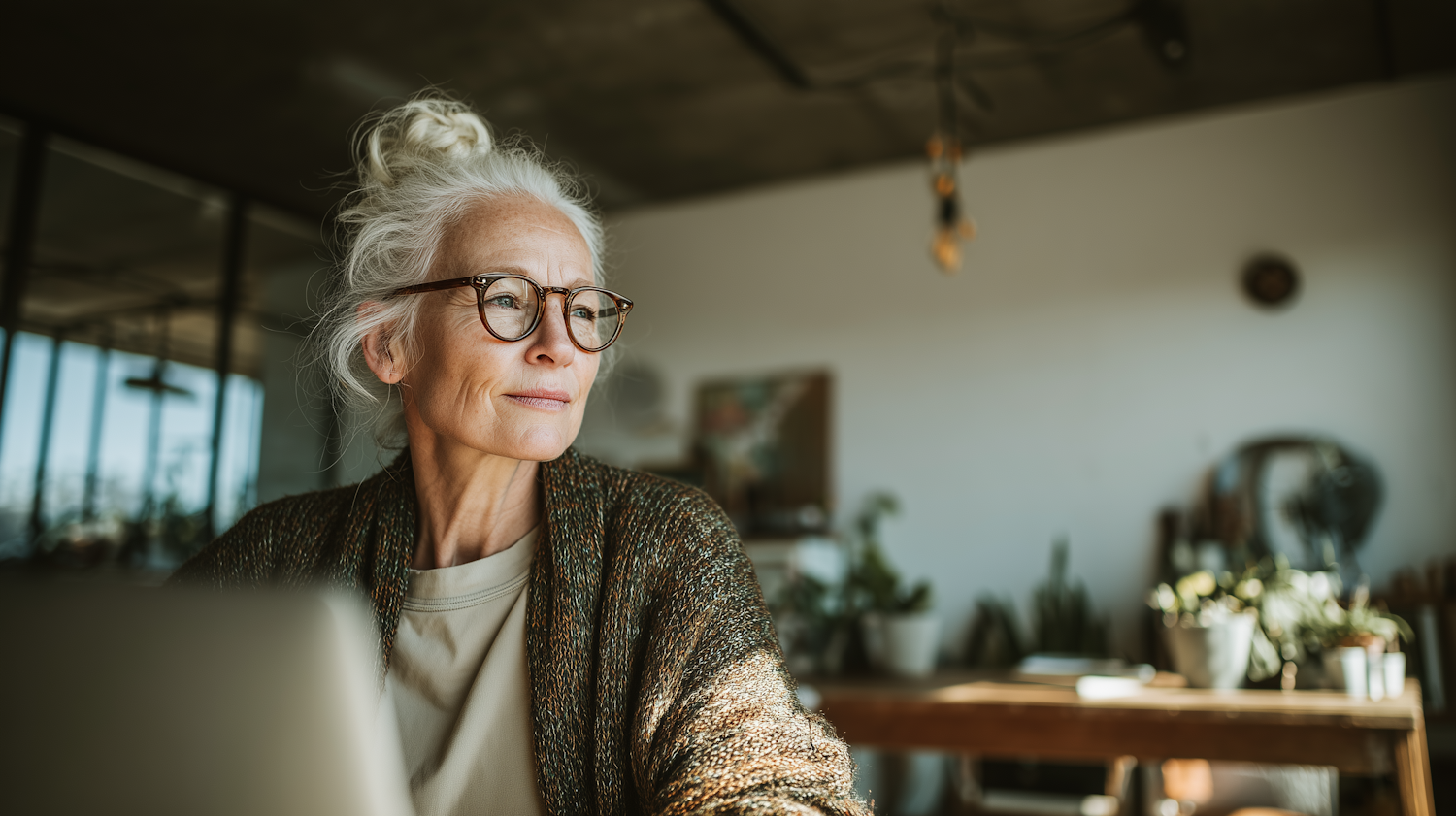 A thoughtful woman with white hair and glasses sits in a cozy, plant-filled room, bathed in soft natural light.