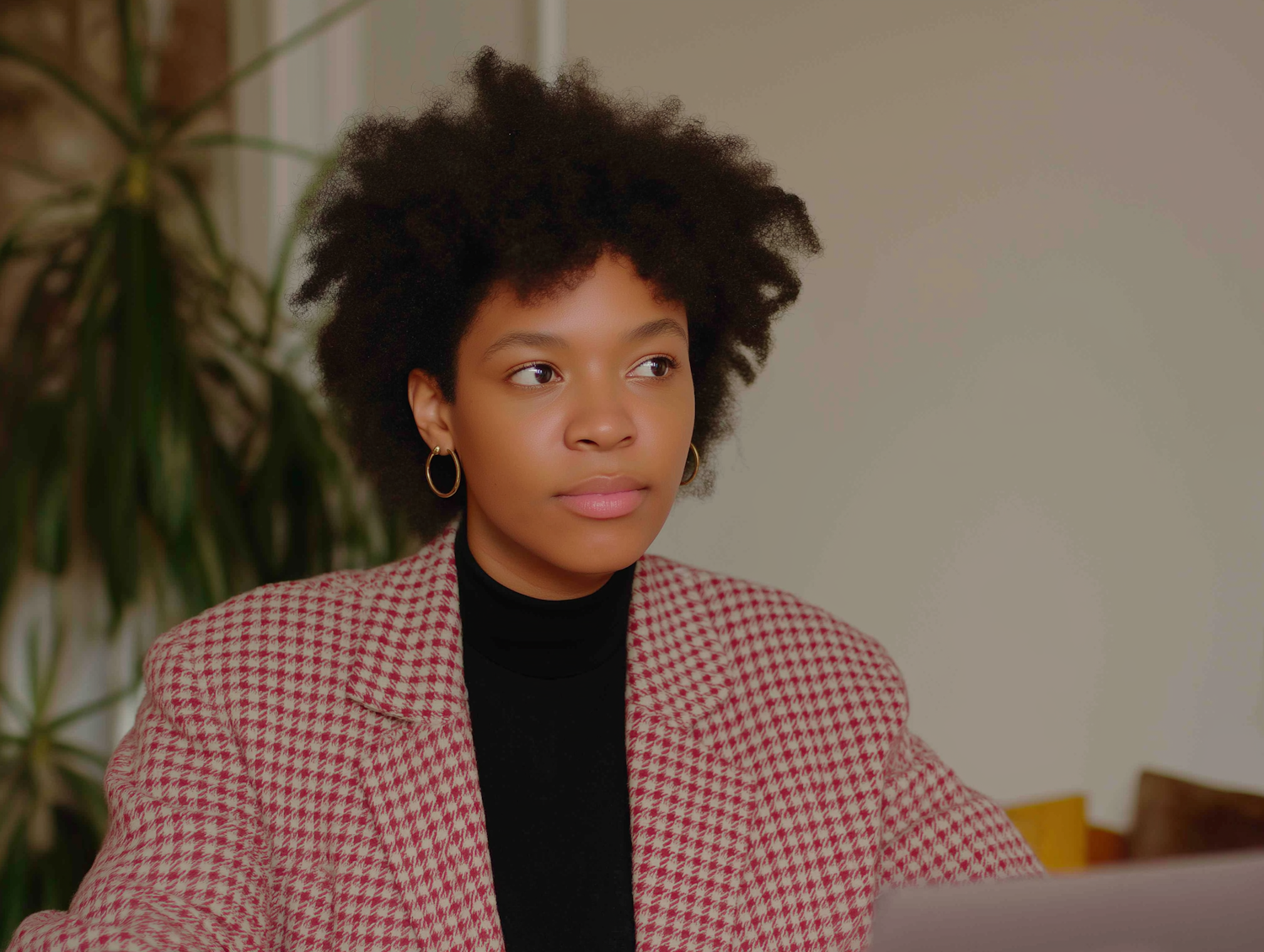 A thoughtful woman in a red checkered blazer and black turtleneck, sitting indoors with a blurred plant in the background.