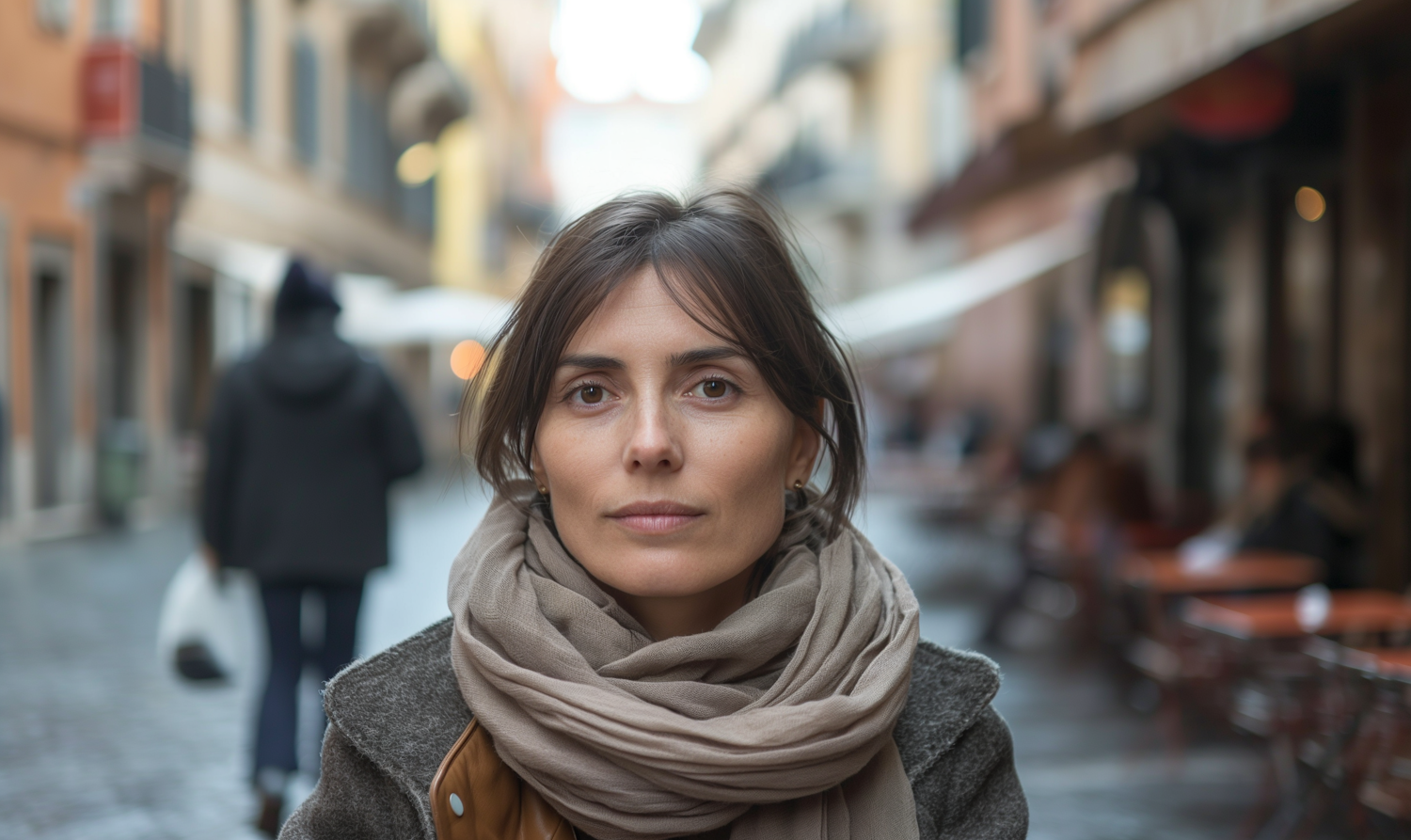 Woman with brown hair and beige scarf in a European street, warm tones, blurred background, neutral expression.