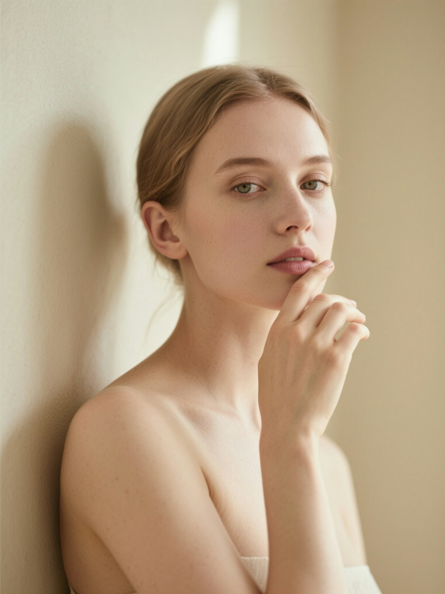 A serene portrait of a young woman with fair skin and light brown hair, softly lit against a neutral background.
