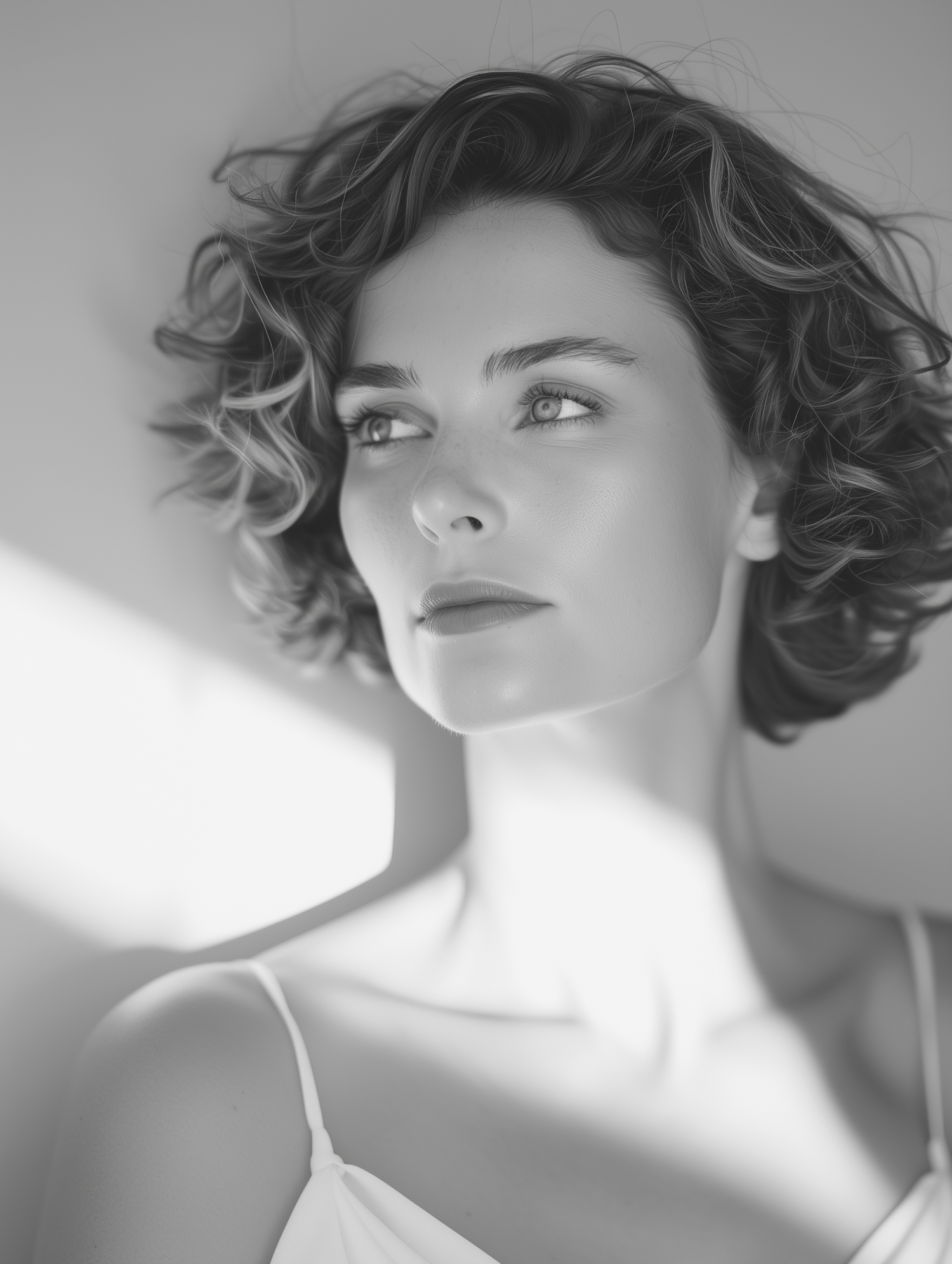 Elegant black and white portrait of a woman with curly hair and serene expression, highlighted by soft lighting and minimal background.