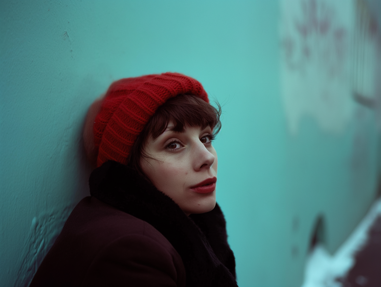 Young woman in red beanie leans against a teal wall, creating a striking contrast. Her contemplative gaze adds depth to the scene.