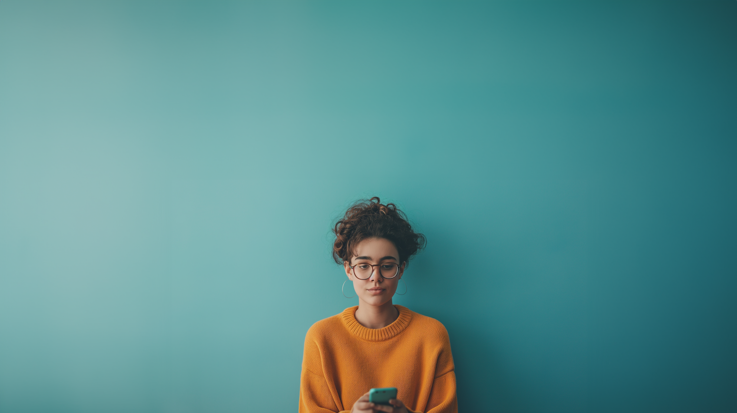 Young woman with curly hair and glasses in orange sweater, focused on smartphone against teal background. Minimalist and vibrant.