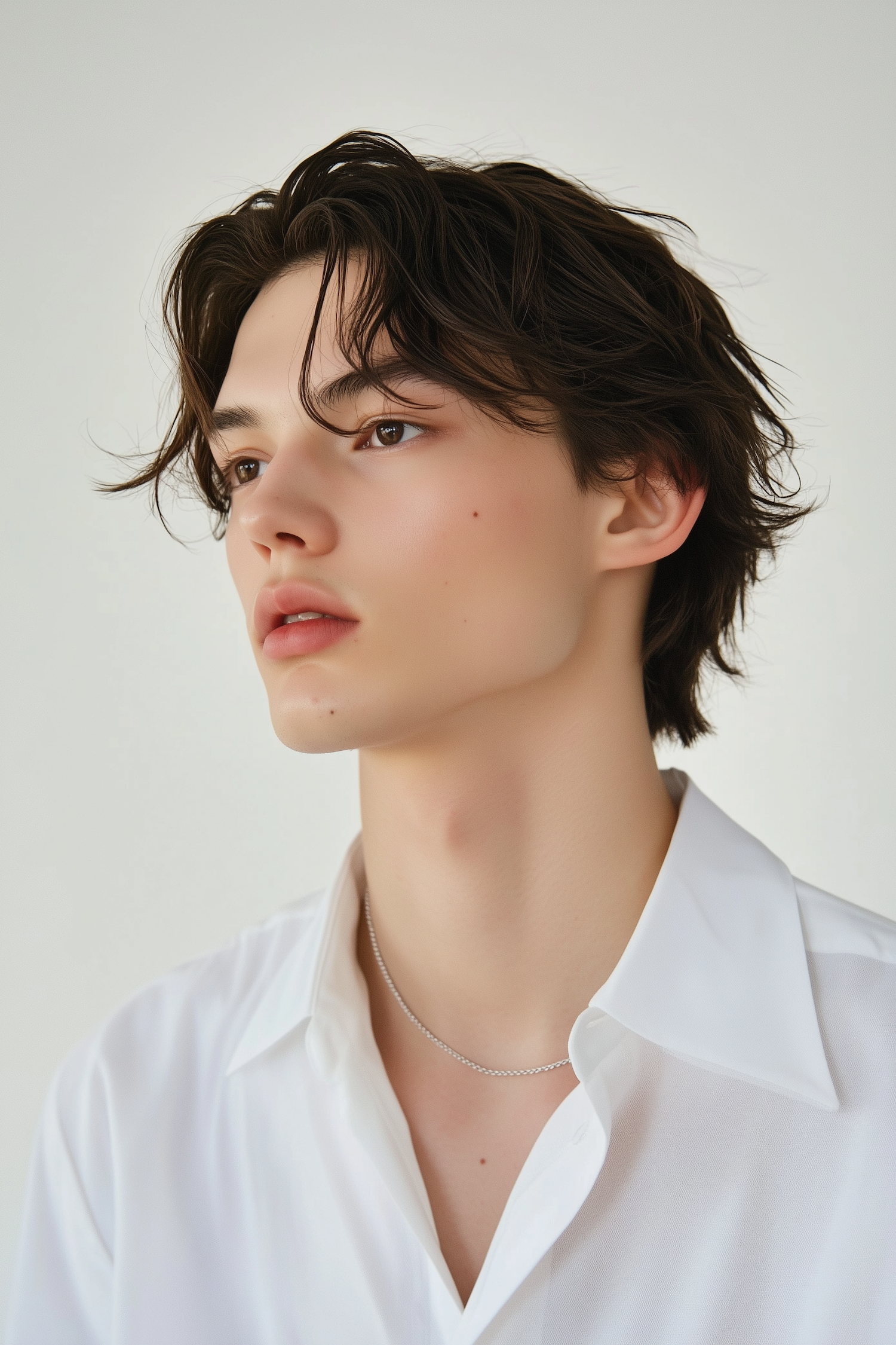 Young man with dark wavy hair, fair skin, and a white shirt, wearing a silver chain necklace against a minimalistic light background.