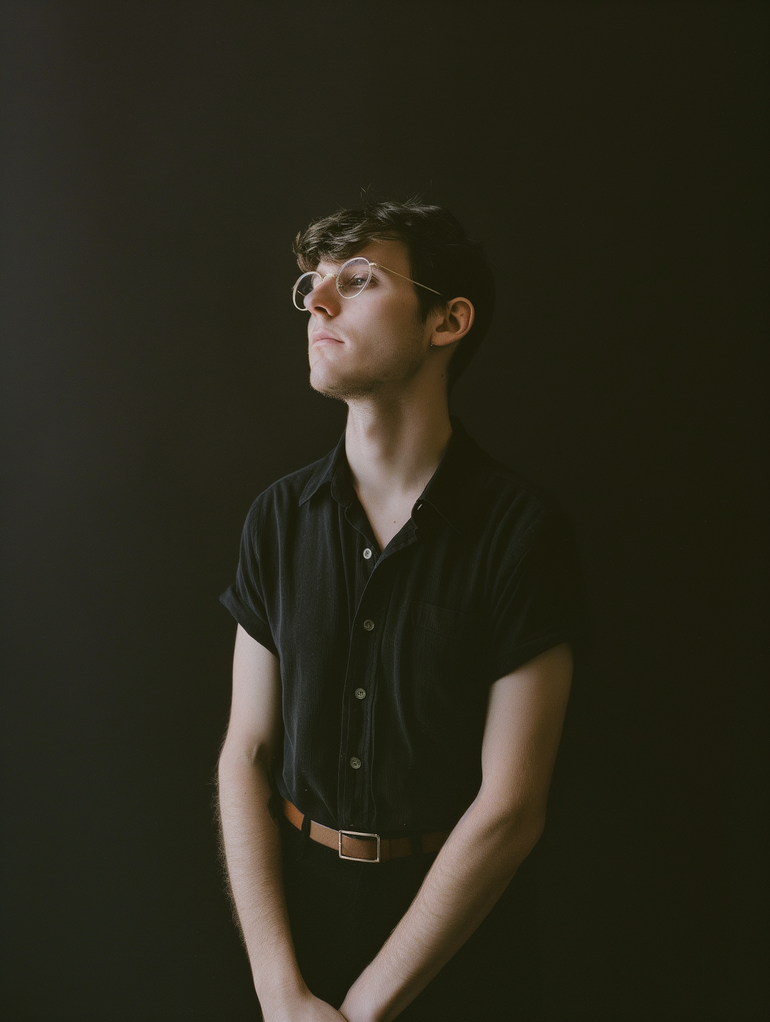 Young man with glasses in a black shirt against a dark background, looking contemplative. Soft lighting highlights his thoughtful expression.