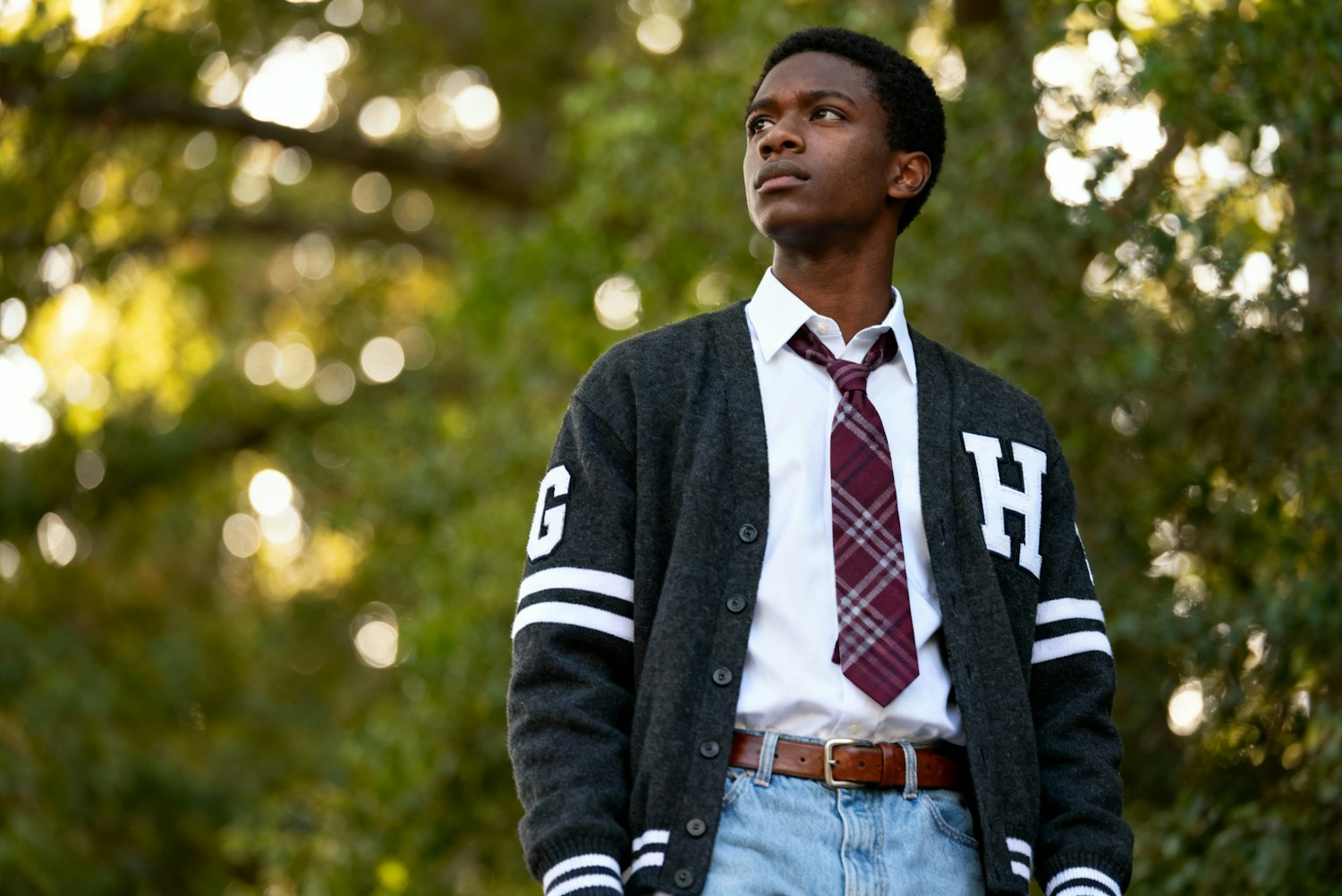 Portrait photograph of a young Black man in preppy academic attire, wearing a dark charcoal varsity cardigan with white letter patches on sleeves and chest, white collared shirt with burgundy gingham tie loosened at neck, light blue jeans, brown leather belt. Shot from low angle looking up, subject gazing thoughtfully into distance with contemplative expression. Natural outdoor setting with lush green foliage background, soft bokeh effect with circular light spots filtering through trees. Professional photography, shallow depth of field, natural daylight, cinematic color grading with muted greens and warm skin tones, editorial fashion style, 35mm lens aesthetic, photorealistic, high detail