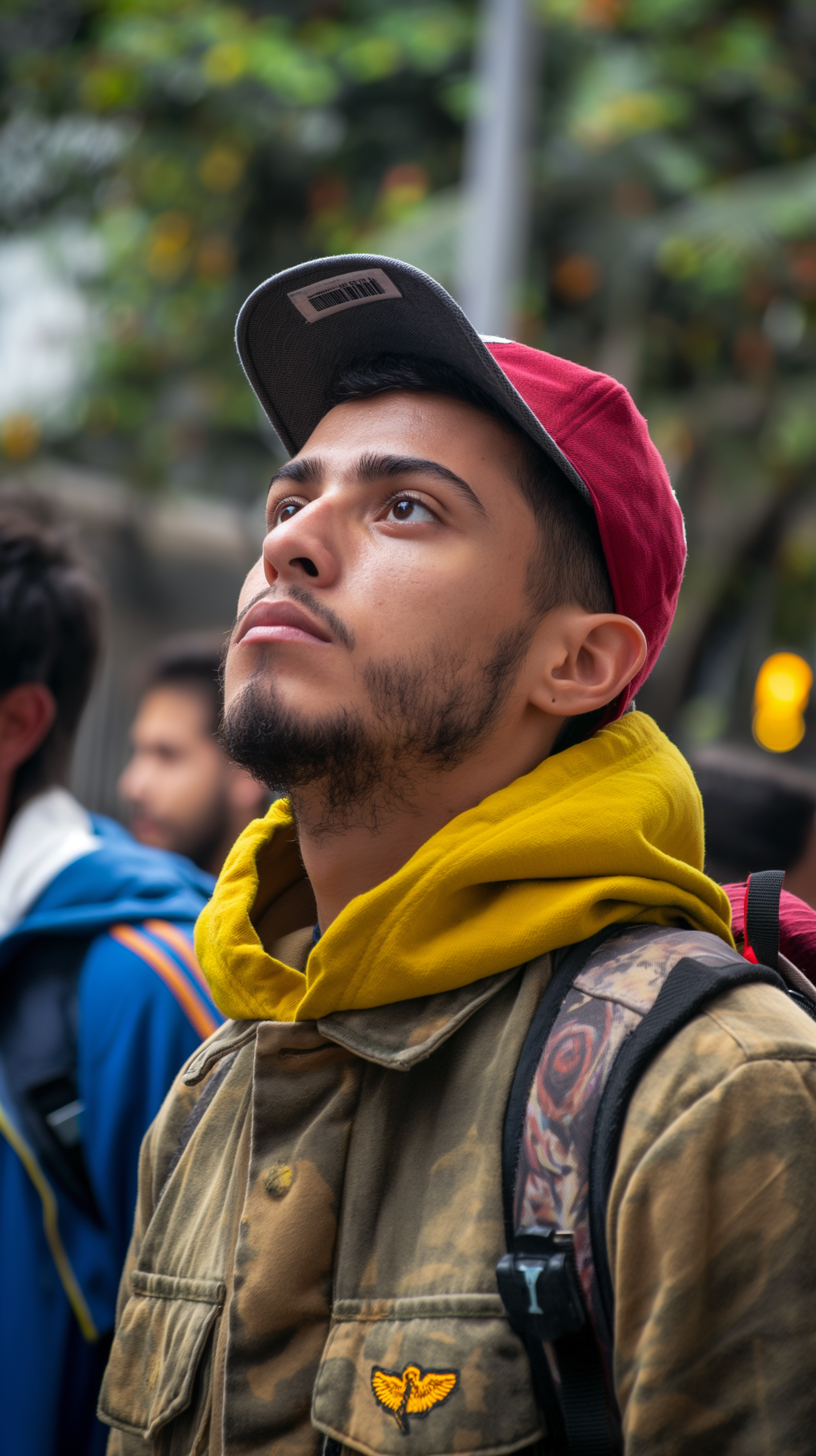 Young man in a red cap, yellow hoodie, and camo jacket gazes upward thoughtfully in an outdoor setting with blurred greenery.