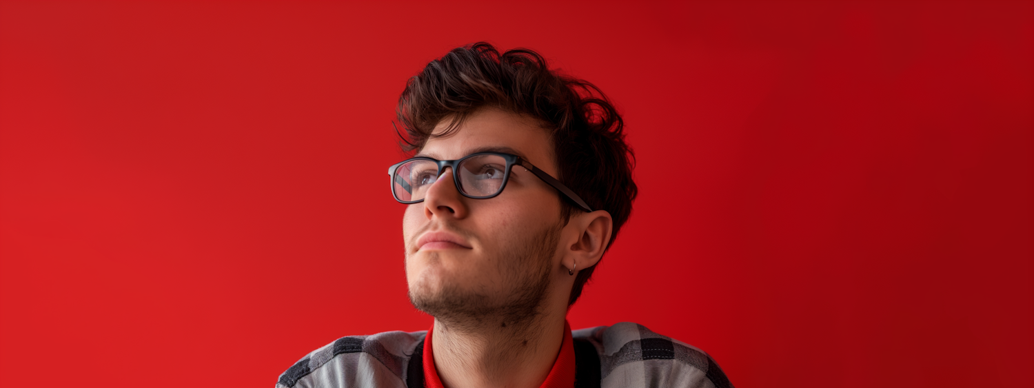 Young man with glasses and wavy hair gazes upward against a vibrant red background, wearing a red shirt and checkered jacket.