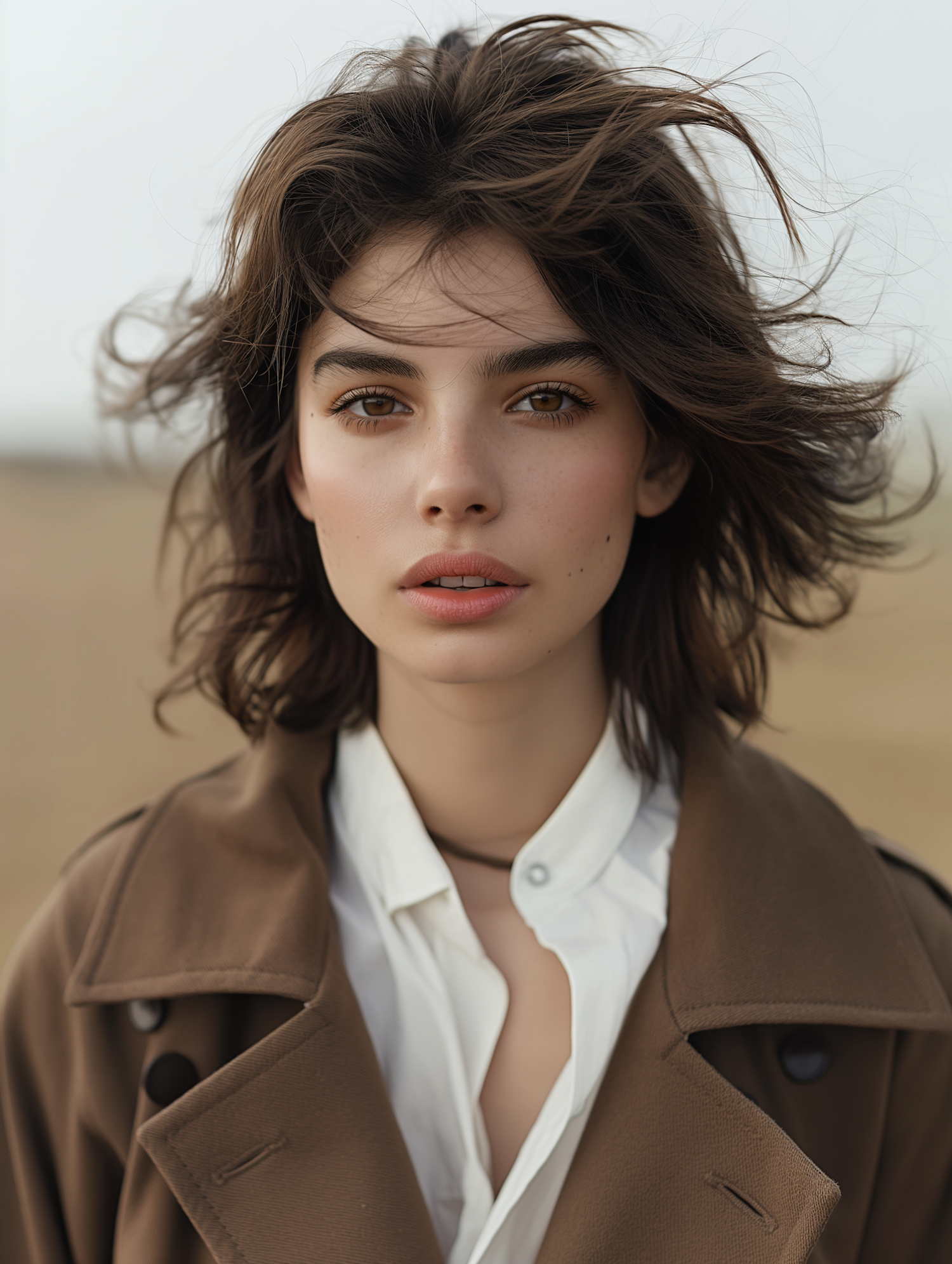 Portrait of a young woman with tousled hair, wearing a brown coat and white shirt, set against a blurred natural background.