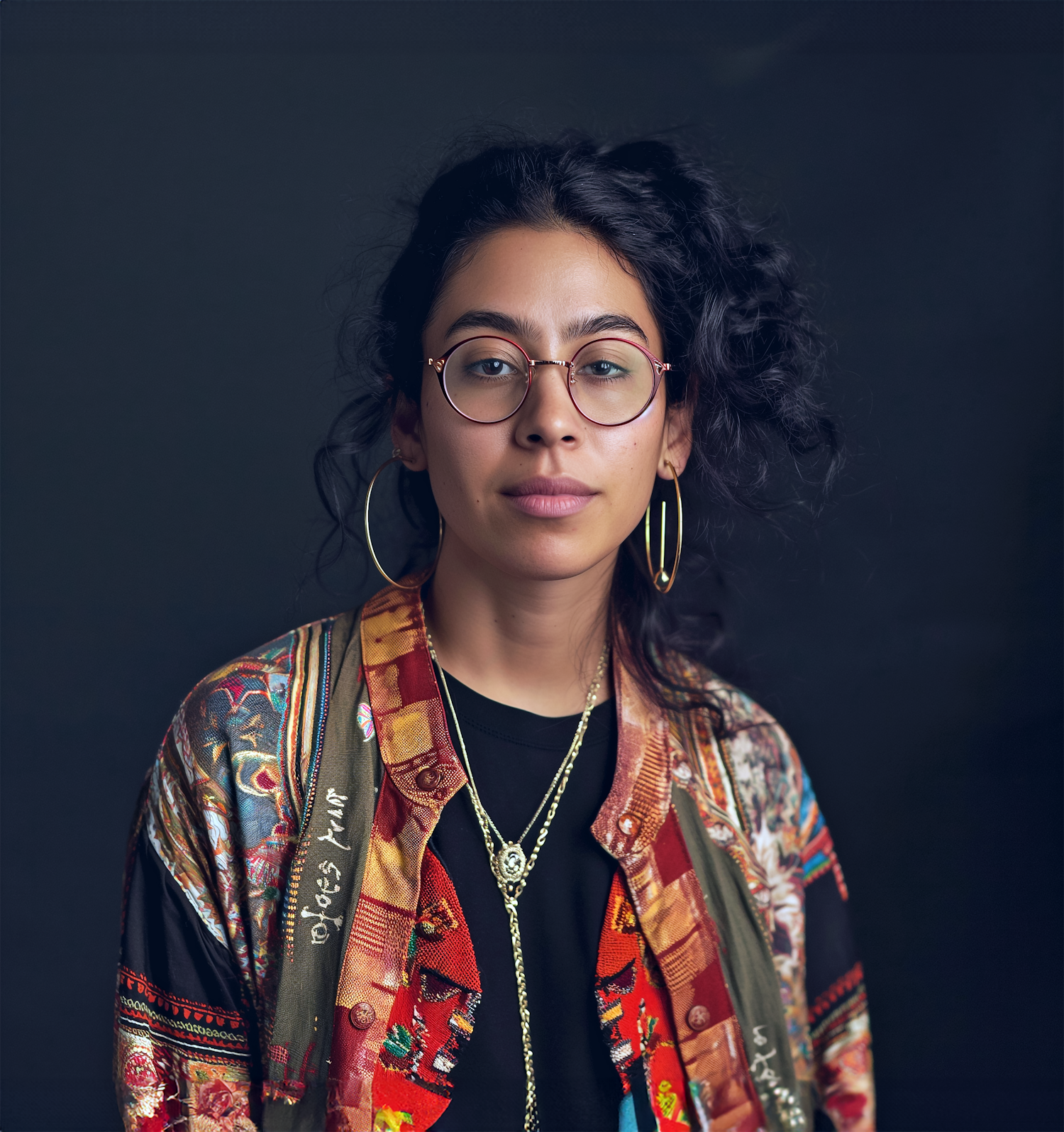 Young woman with curly hair, round glasses, and colorful jacket exudes confidence against a dark background.