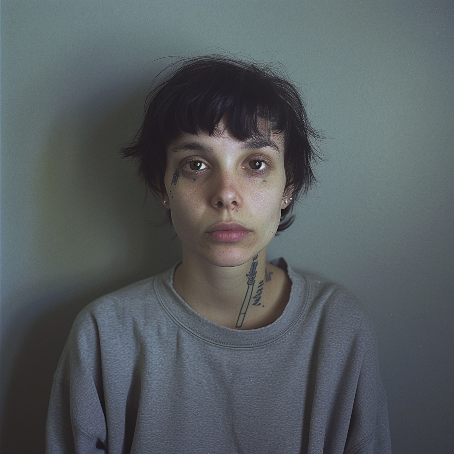 Portrait of a young person with tattoos, short dark hair, and a gray sweatshirt against a muted gray background.