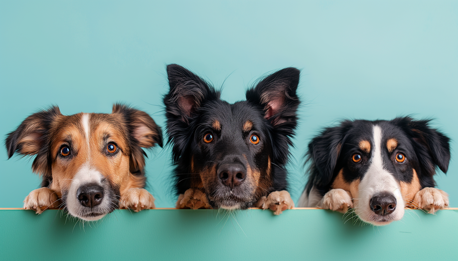Three adorable dogs peeking over a teal ledge, showcasing their expressive eyes and unique coats.