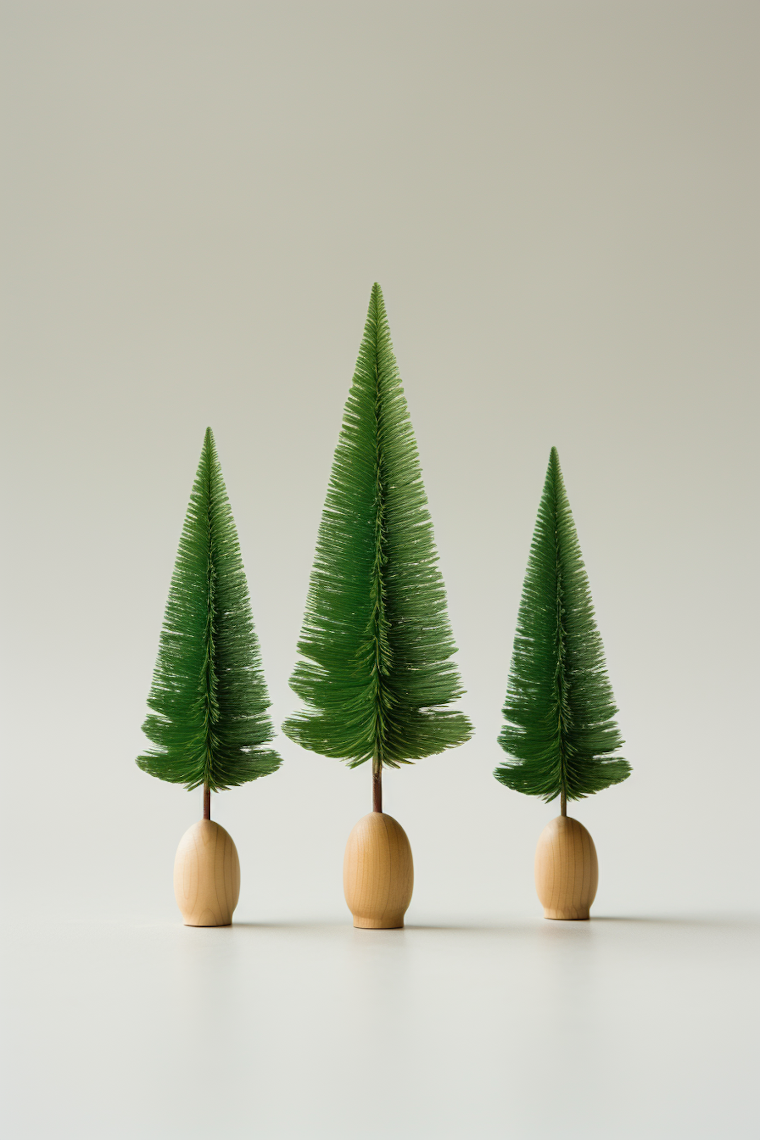 Three miniature evergreen trees with wooden bases, arranged in a row against a neutral background, creating a minimalist and serene scene.