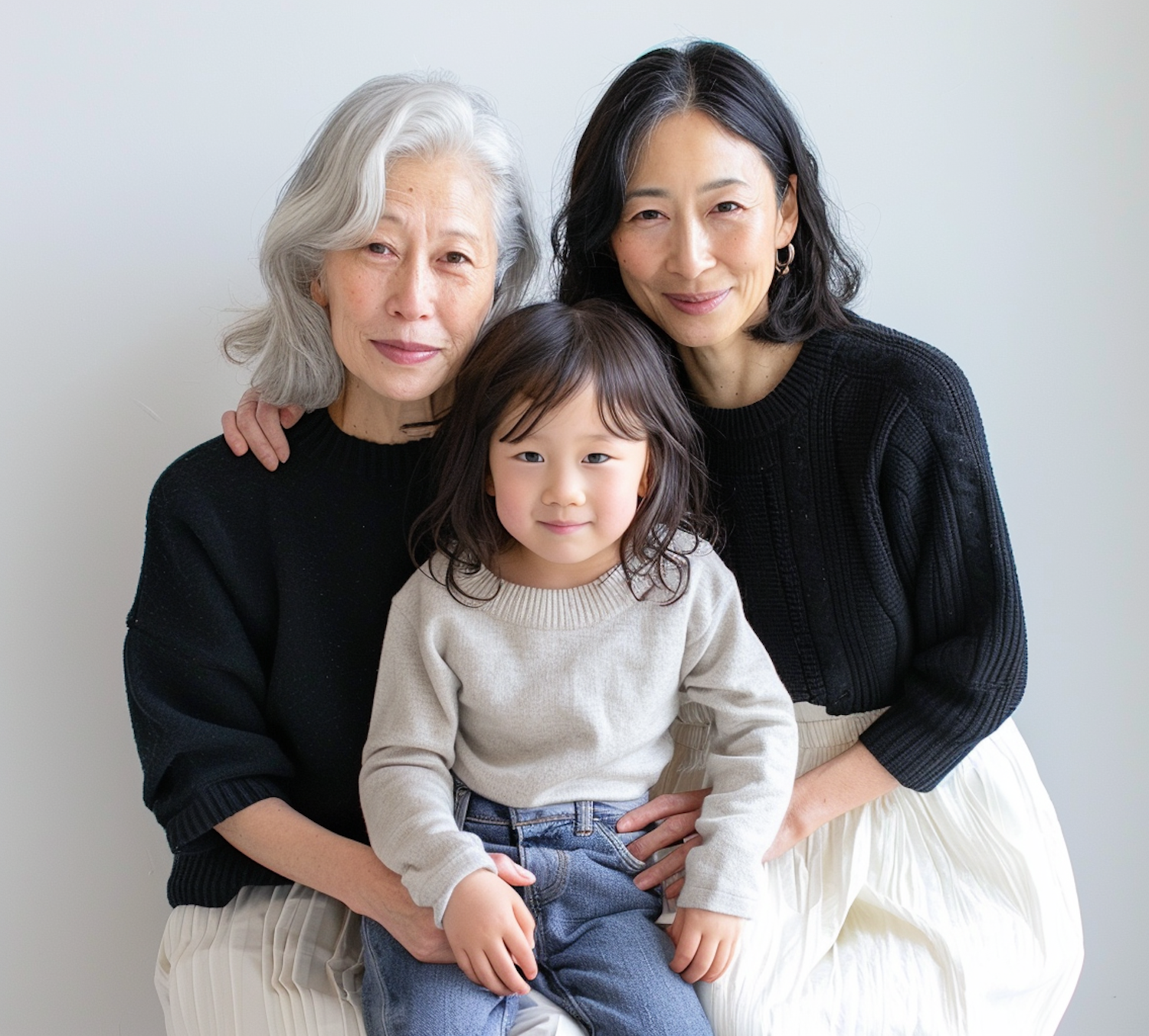 Three generations of Asian women smiling warmly in a family portrait, showcasing love and connection across ages.